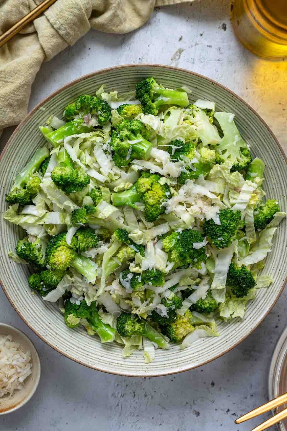 - Parmesankäse: Der Käse gibt dem Brokkolisalat den leckeren Umami-Geschmack, für den Caesar-Dressing bekannt ist.