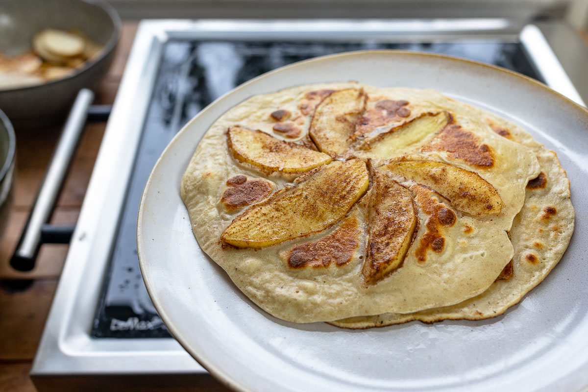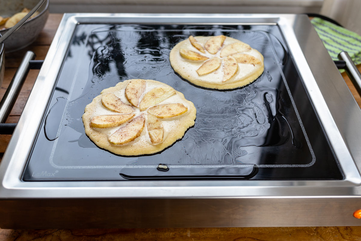 - Using a ladle, pour some of the batter onto the hot surface. Top with apple slices. Cook until golden brown and firm, then gently flip and cook on the other side for 1-2 more minutes. (see video). Repeat until batter is used up, add a little more ghee between rounds.