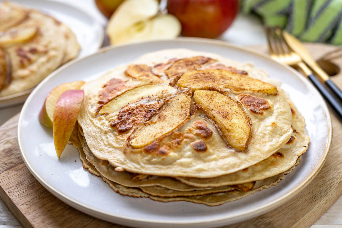 When it comes to the question of thin or thick pancakes, well, I am all for thin. This of course, could be a topic of much debate. There are all kinds of preferences. I have always been a fan of thin English or French pancakes, but if you are coming from team “fluffy pancakes please” then my classic Canadian pancakes are for you. They are great with the addition of blueberries, sliced banana and of course apples!