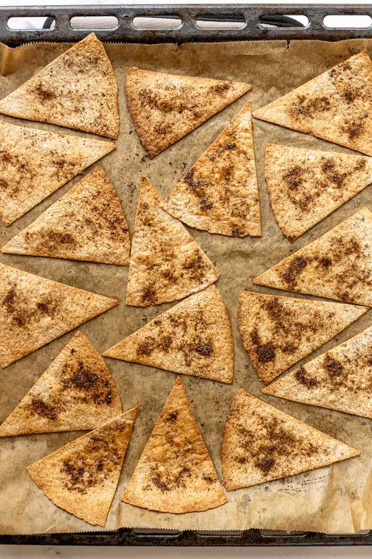 - You can also brush both sides of the tortillas with oil before cutting them into triangles. Stack and cut into sixths or desired size. Be sure to sprinkle with the za’atar spice while the tortillas are still moist from the oil to that the spice sticks to the chip.