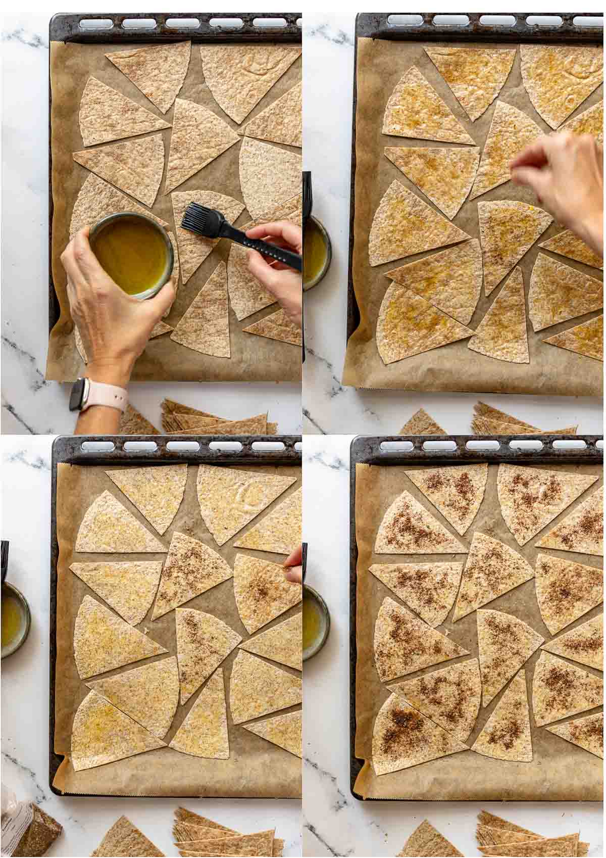 Spread the tortilla triangles in an single layer on the prepared baking sheet. Use a pastry brush to lightly coat both sides of tortilla with olive oil, then sprinkle za’atar.