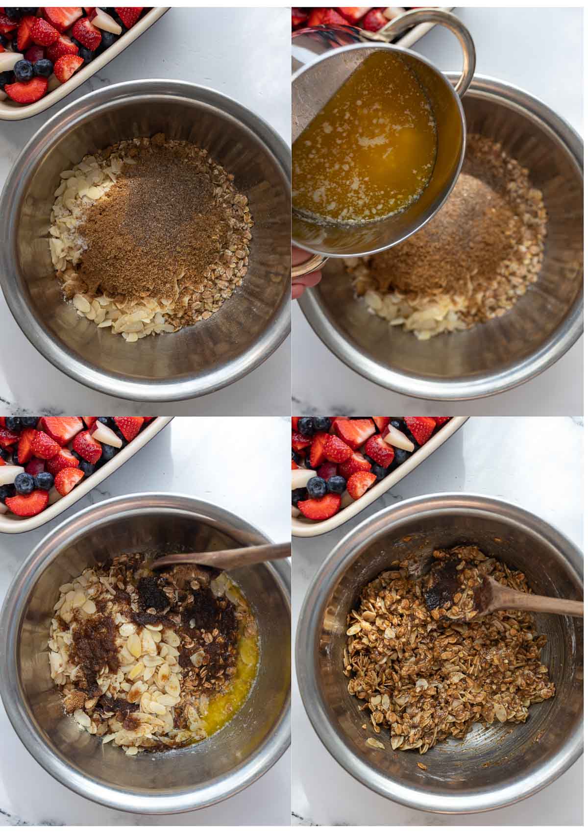 In a medium bowl, whisk together the oats, flour, sugars, cinnamon, salt and almonds. Pour over the melted butter and stir until well combined.