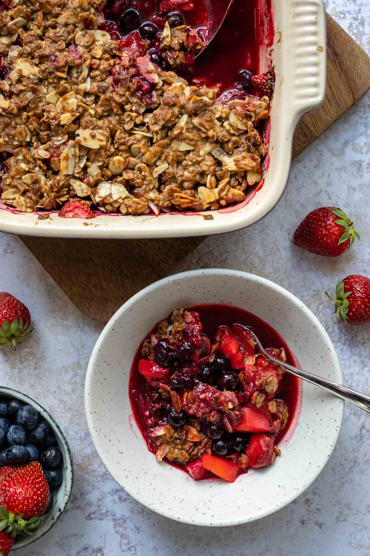 This berry crumble with almonds and oats is very flexible. You easily tweak the crumble recipe to your own liking and use your favourite mix or fruit and berries. You can also easily adapt this recipe to make it vegan or gluten-free.