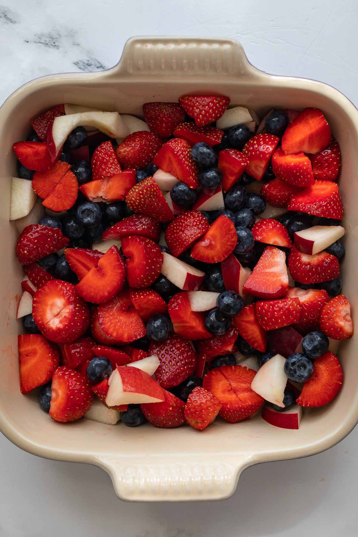 Fruit – I love a mix of berries and stone fruit. You can mix things up and use your favourite combination. Try trading out nectarines for apricots (or try peaches or plums), and use any of your favourite combinations of berries — or try a mix of berries and currants, such as raspberries, blackberries, blueberries, redcurrants or blackcurrants. You’ll need 4 – 4,5 cups of fruit for this recipe.