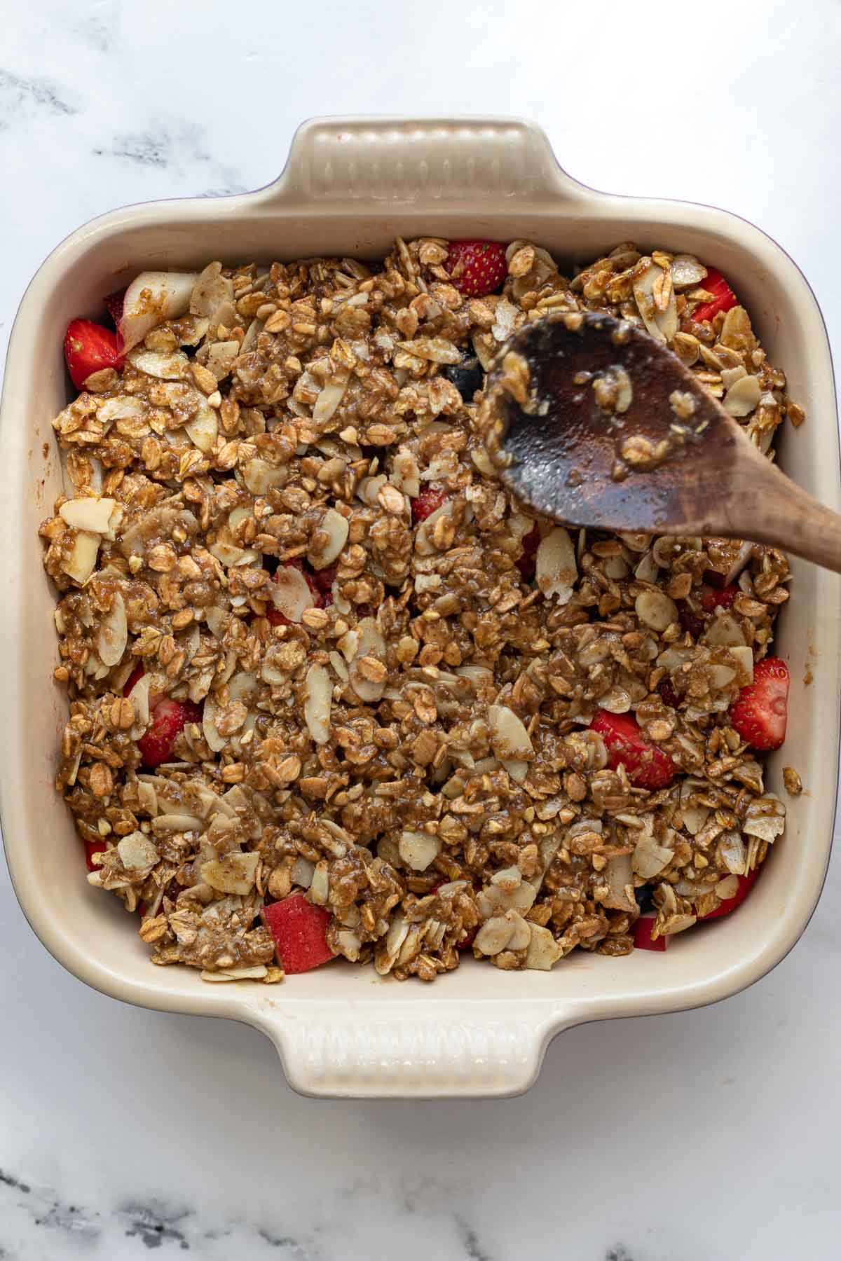 Scatter the oat mixture evenly over the fruit and then transfer to the preheated oven.