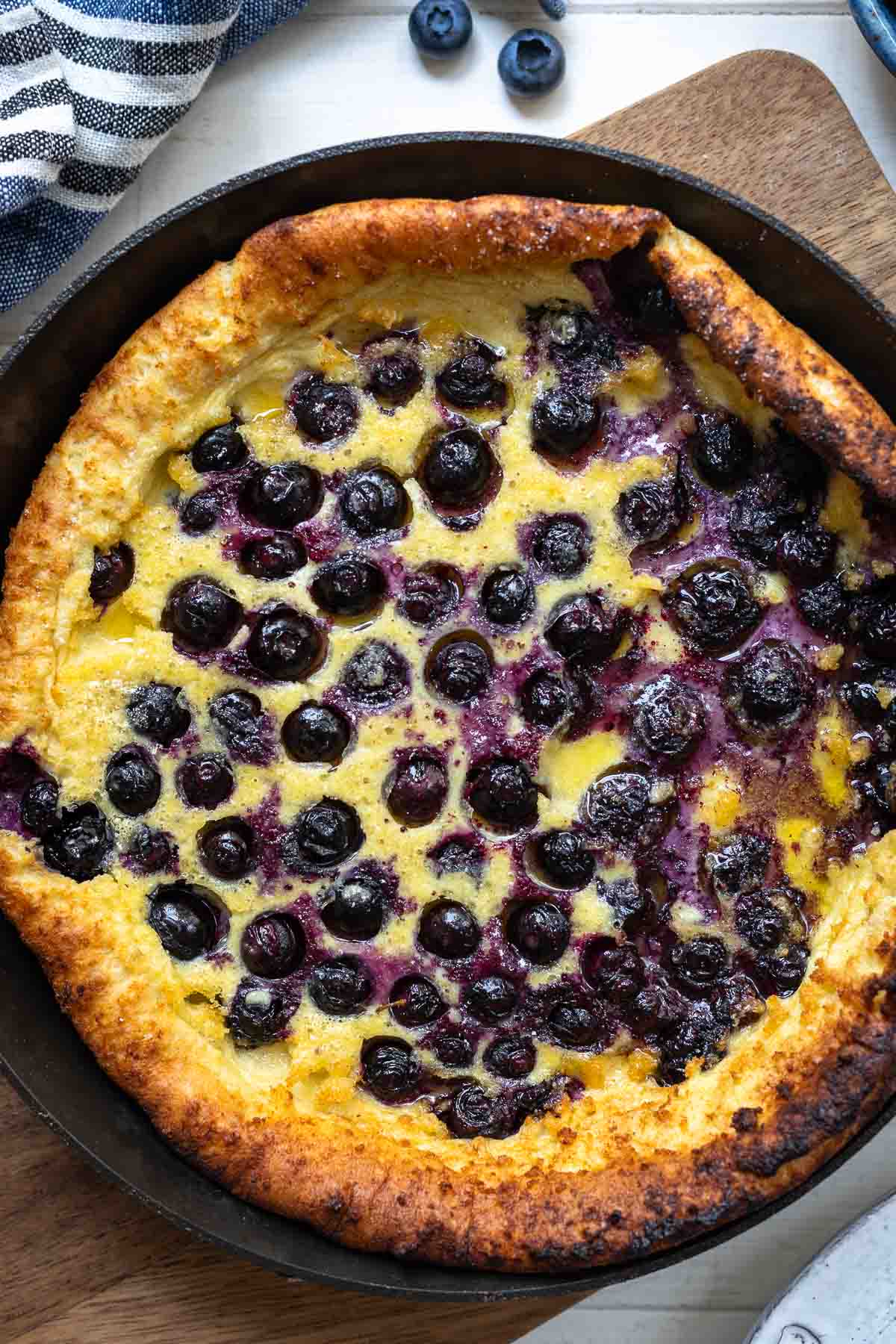 Pour the batter into the skillet, and scatter the blueberries over top. Transfer to preheated oven and bake until the Dutch Baby is puffed and edges are deeply golden, 18-20 minutes.
