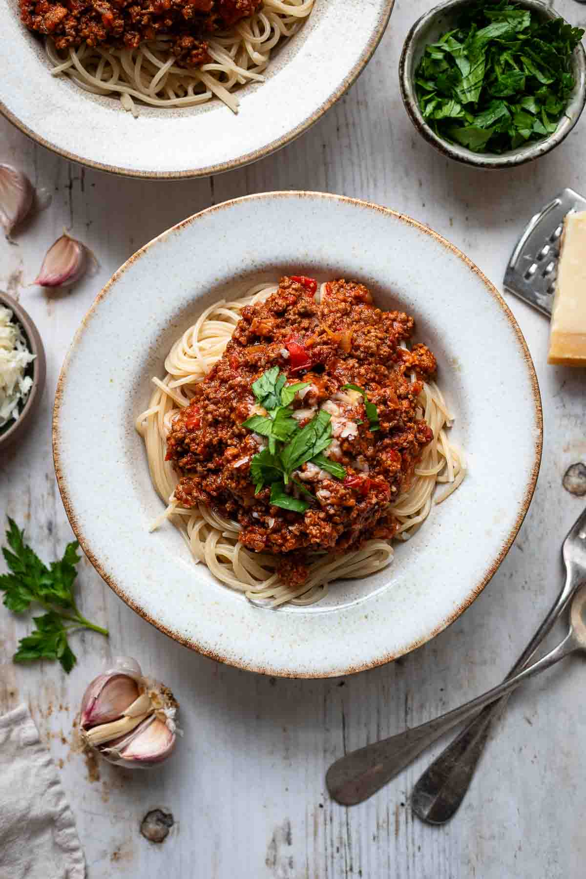 This slow-simmered homemade bolognese sauce recipe boasts a deep, rich, meaty flavour without the traditional soffritto base. Perfect for topping your favourite pasta dishes, it's a freezer staple you'll always want on hand.