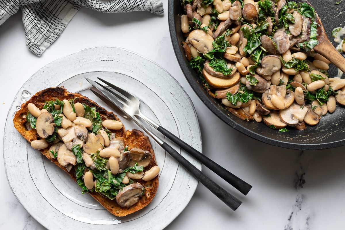 This one-pan recipe for braised mushrooms and white beans is light, creamy and simply delicious. The combination of sautéed mushrooms, garlic, winter greens, cannellini beans, thyme, crème fraîche and a squeeze of lemon is a simply but heavenly combination. Enjoy it on its own as a meal for two or served on toast for a quick and easy lunch or meal for busy nights.