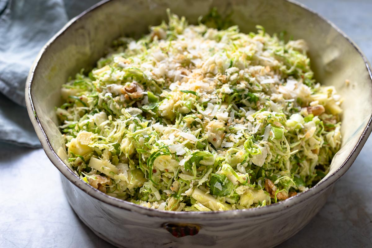 Since this is a raw salad, I recommend buying organic. It’s also important to wash the Brussels sprouts really well and remove any damaged leaves that are damaged. If you are using a food processor to shred the sprouts, then be sure to trim off the ends with a sharp knife.