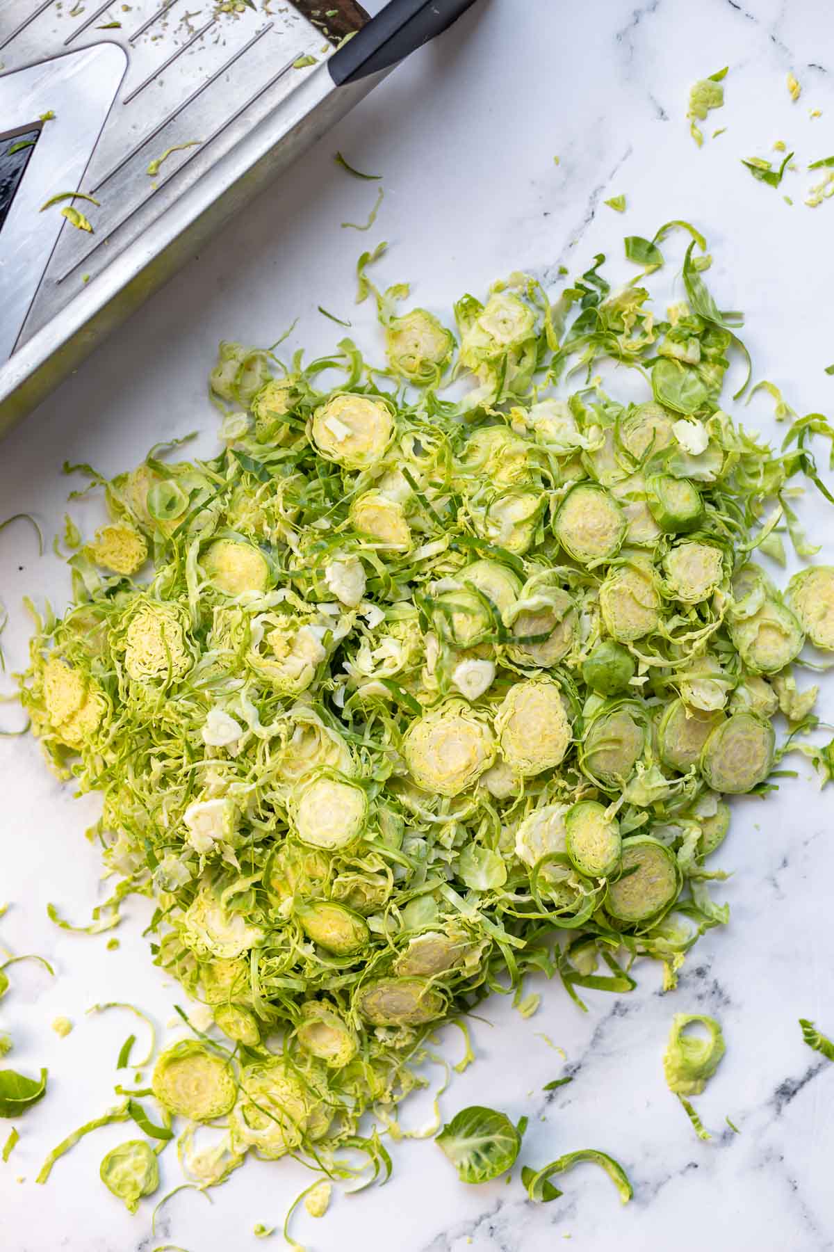• Shredding Brussels sprouts without special equipment: Simply trim the ends of the sprouts. Then cut them in half lengthwise. Lay the cut-side-down and finely slice as thin as possible.