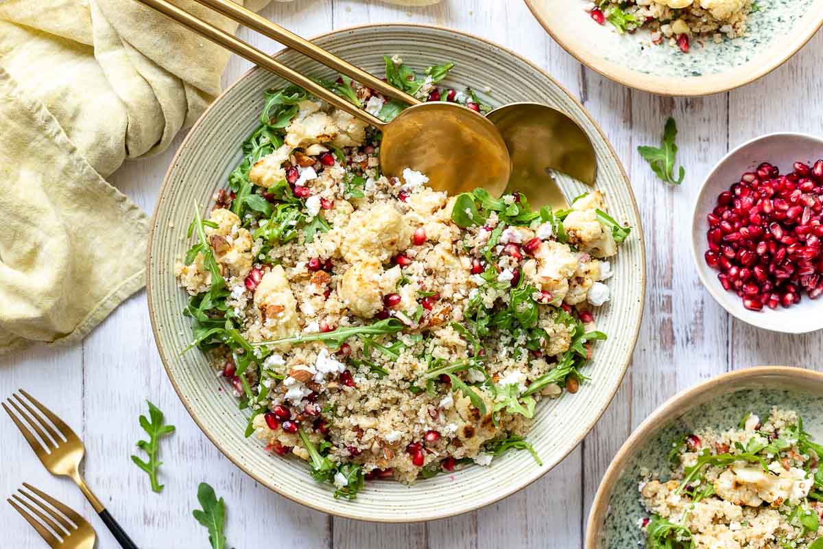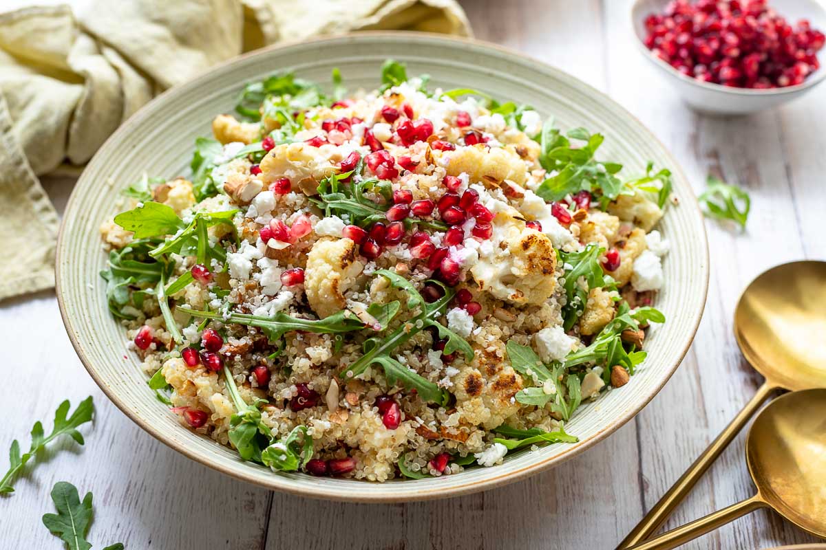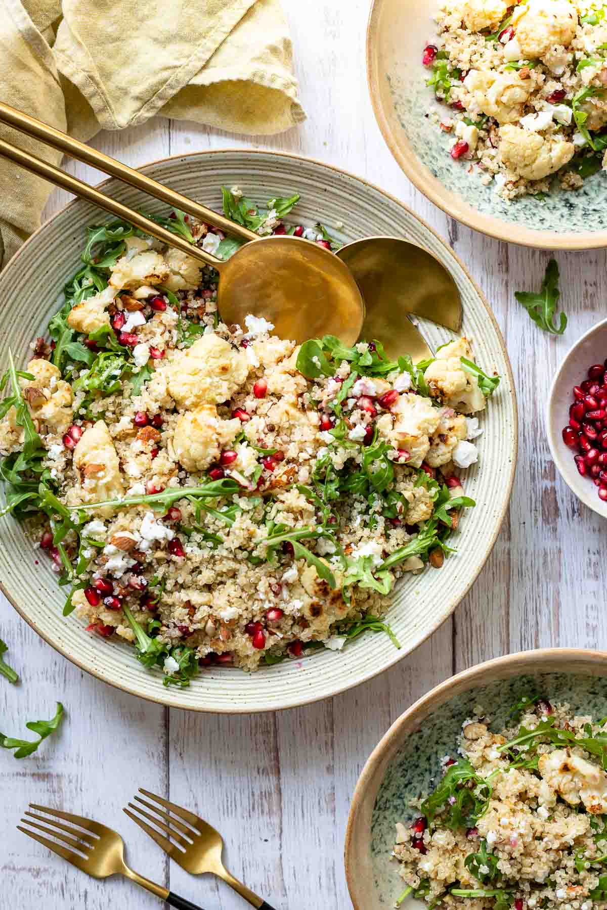 A gorgeous roasted cauliflower quinoa salad tossed with young arugula leaves, feta cheese, pomegranate seeds and toasted almonds. This simple and easy to make cumin and coriander spiced cauliflower quinoa salad is lightly dressed with a freshly squeezed lemon juice for the perfect lunch or side dish!