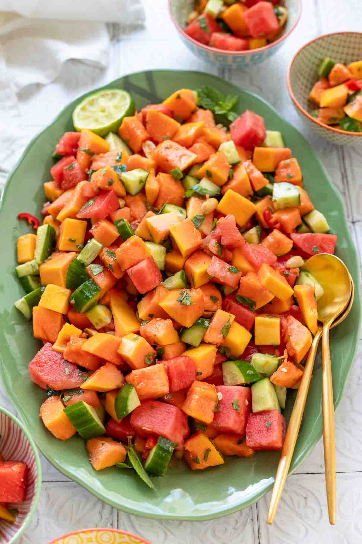 Chili Papaya Watermelon Salad with Cucumber & Roasted Peanuts