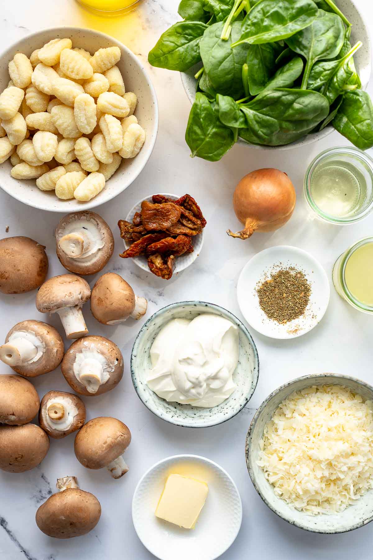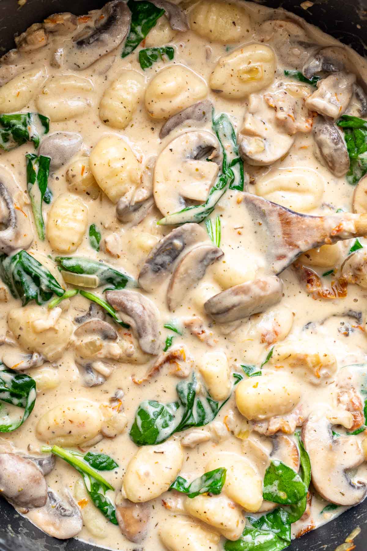 This spinach and mushroom gnocchi with sun-dried tomatoes dish is the ultimate in comfort food. It’s deliciously rich, creamy and satisfying.