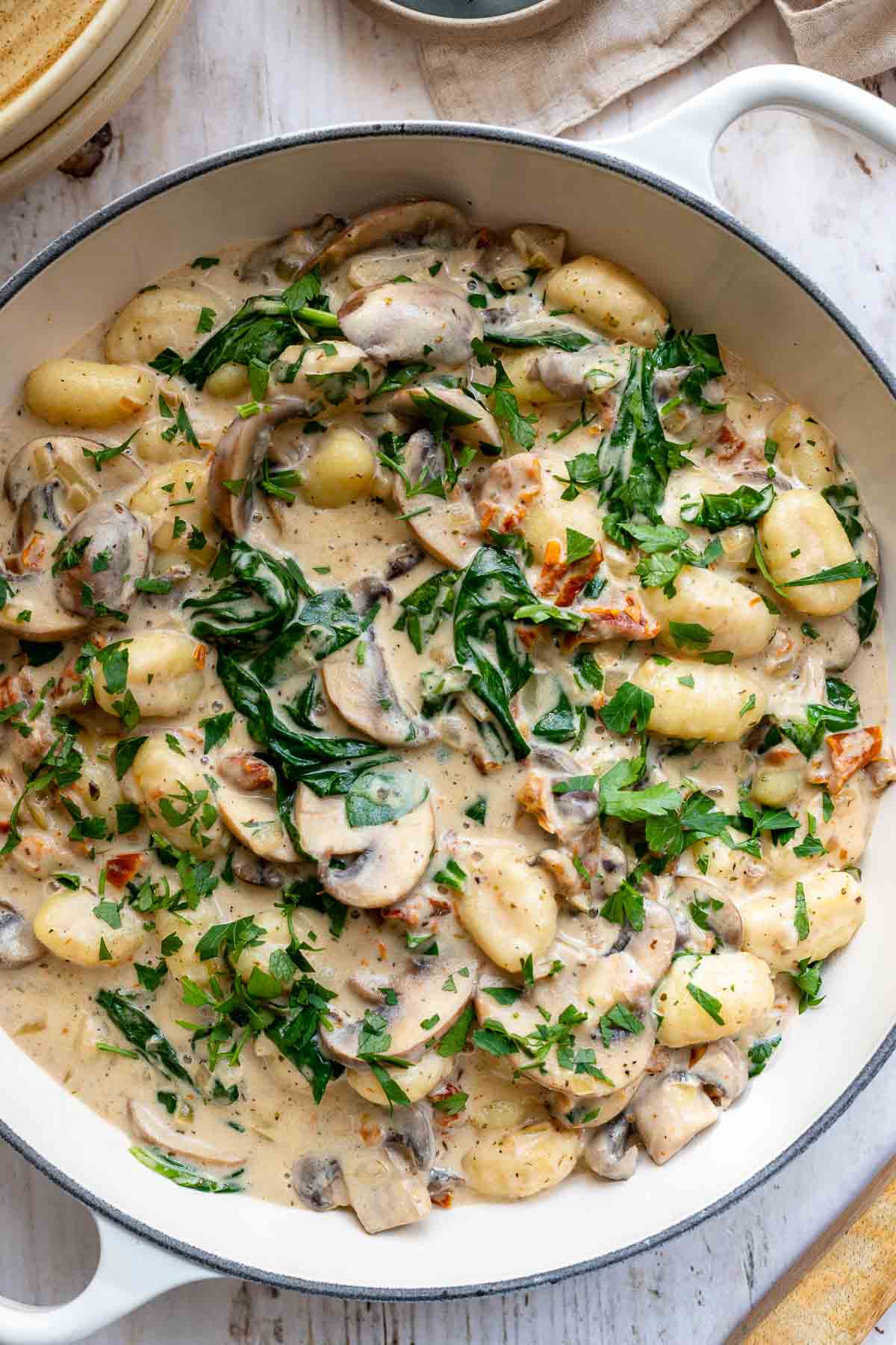 Creamy mushroom gnocchi is the ultimate in comfort food! The creamy crème fraîche sauce with sun-dried tomatoes and spinach is deliciously rich, creamy and satisfying. Using fresh, store-bought gnocchi, it’s quick and easy to make, making it a great weeknight choice.