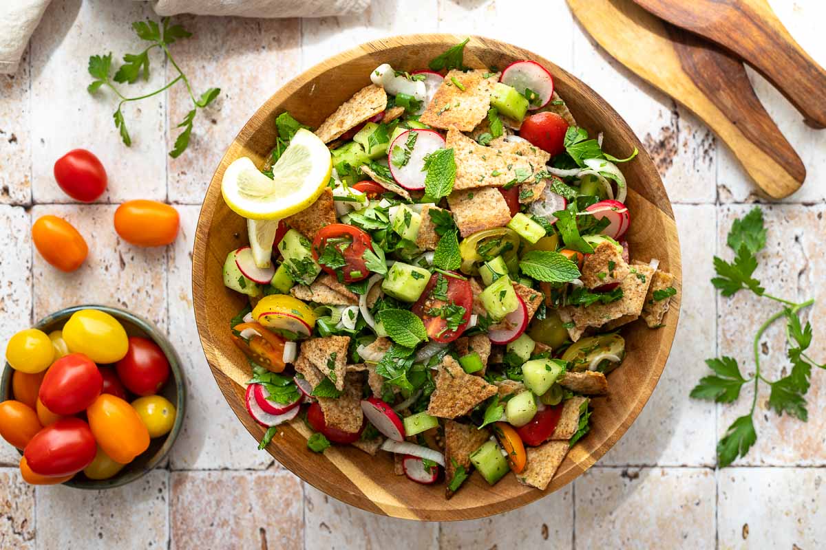 As tradition be, this salad is meant to be made with whatever leftover produce (or bread) you have on hand. Of course, for the best Fattoush salad, you’ll want to start by selecting the best and freshest produce you can find (sweet ripe tomatoes, super fresh herbs). Here are a few example, of how you could adapt this Fattoush salad recipe: