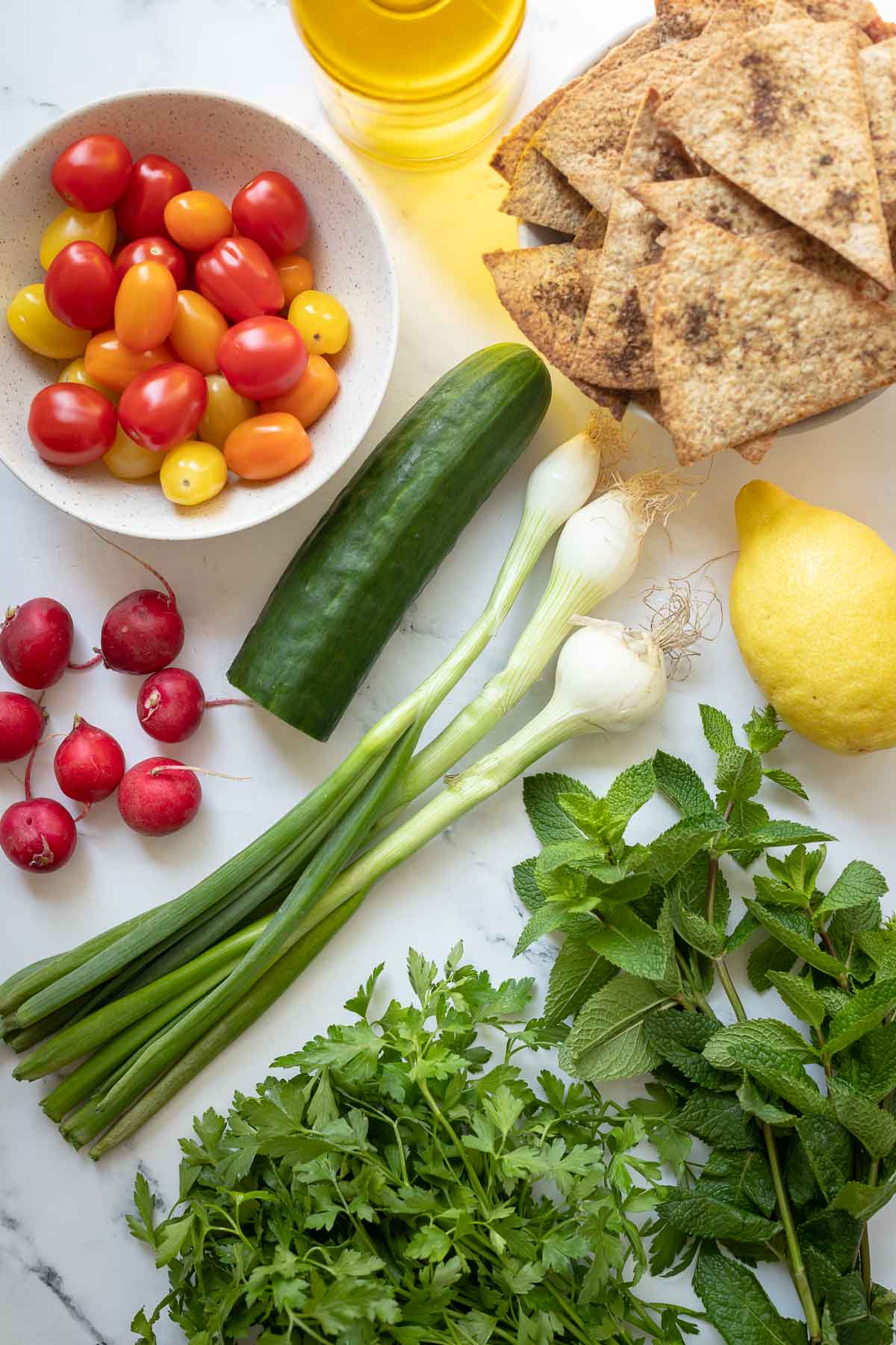 In a large shallow serving bowl, add the cucumber, tomato, radishes, onion, herbs, oil, lemon juice and seasoning. Toss until well incorporated. Add the toasted tortilla/pita chunks and toss until combined. Taste and adjust seasoning, as desired.