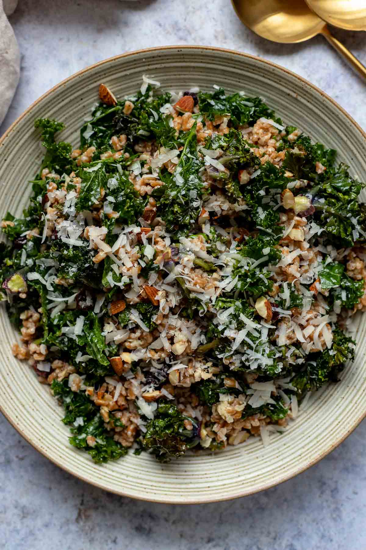Add the cooked spelt, roasted flower sprouts, dried cranberries, parmesan cheese, and almonds to the bowl with the kale. Drizzle over the dressing and toss until well combined. Taste and adjusting seasoning, as needed.