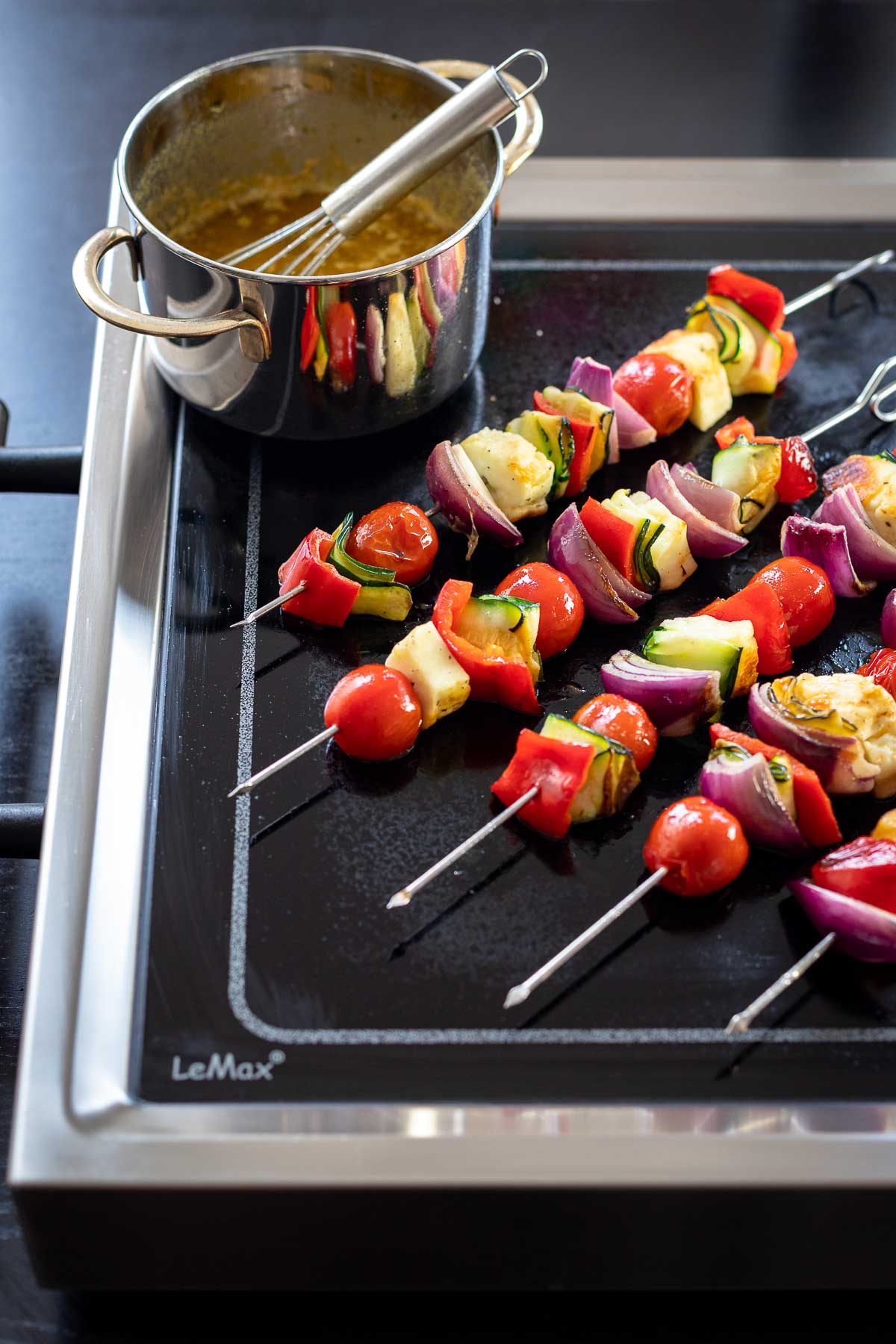 Once again, I put my ELAG LeMax to the test — this time with grilled kebabs with vegetables and halloumi. The most surprising thing for me was that grilling kebabs on the LeMax actually taste like the came right off a traditional outdoor BBQ. You get that wonderful smoky flavour that is so well recognised from outdoor grilling. And this, all in the comfort of your home, anytime of year, any type of weather. And another benefit is that thanks to its large cooking area, you can actually prepare a pot with the sauce directly on it surface. And to control its heat, just move the pot to the outside edge of the cooking surface for the “keep warm” area. Easy peasy.