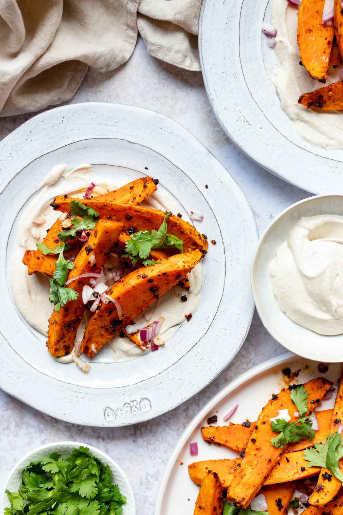 Serve with yoghurt-tahini sauce the side or, do as I do and spread some of the sauce on a plate, then top it with the sweet potato wedges and some extra cilantro leaves.