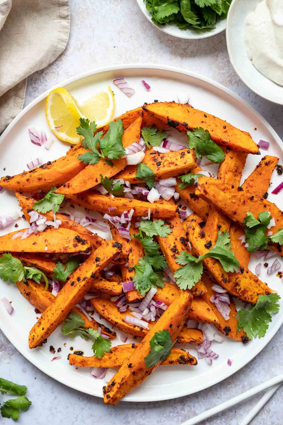 Remove the sweet potato wedges from the oven and gently transfer to a serving plate. Sprinkle with the red onion, drizzle with freshly squeezed lemon juice and finish with a handful of parsley or cilantro leaves.