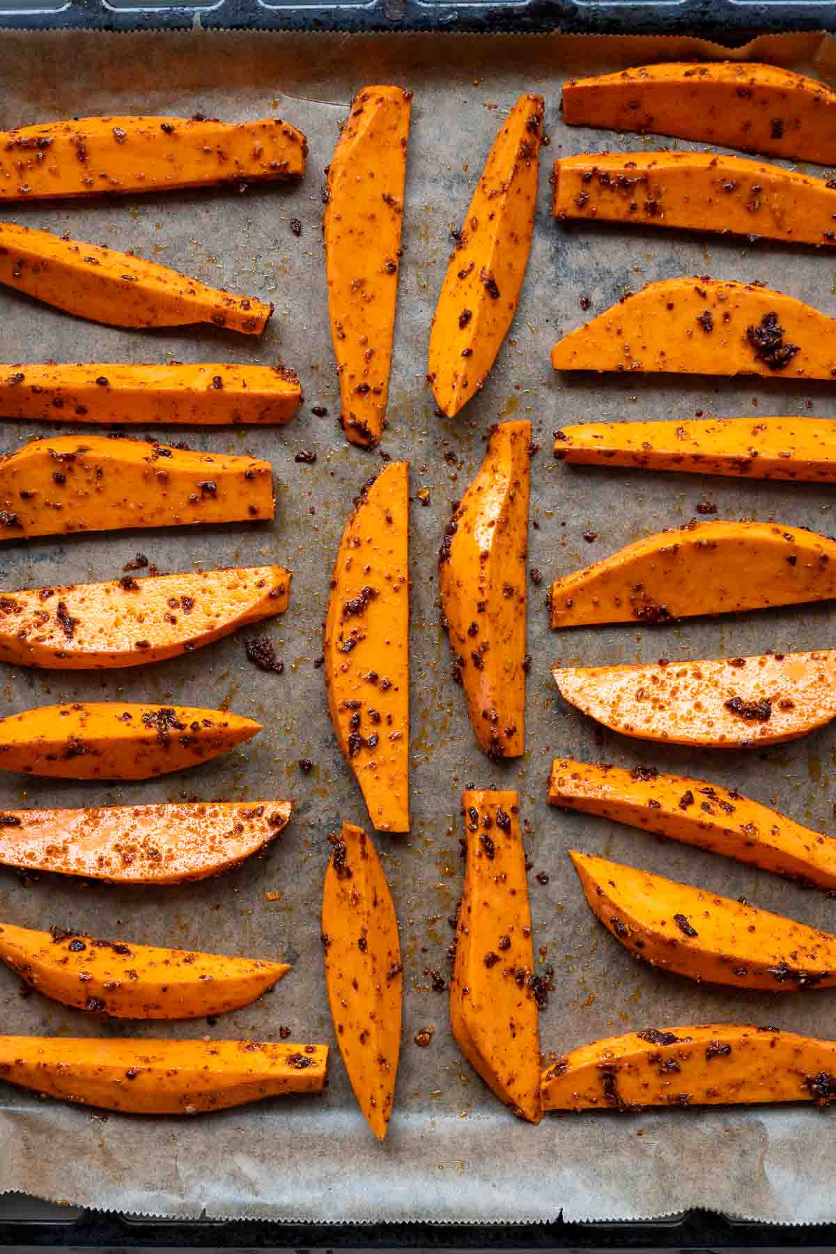 Transfer to the oven and roast for 15 minutes, then remove from the oven and flip the wedges over carefully. Return to the oven and bake for another 10-15 minutes, until the sweet potatoes wedges are lightly browned on the edges and tender.