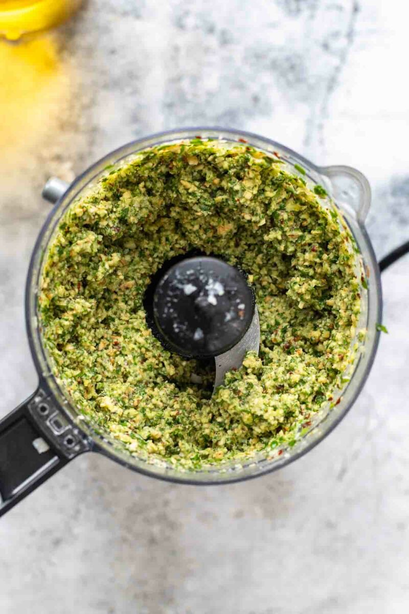 As with most pesto recipes, simply add all the ingredients to a blender or food processor and pulse until you have a coarse, spoonable paste. Adjust the consistency with a little extra olive oil if needed. Whether you prefer it thick and rustic or smooth and silky is entirely up to you!