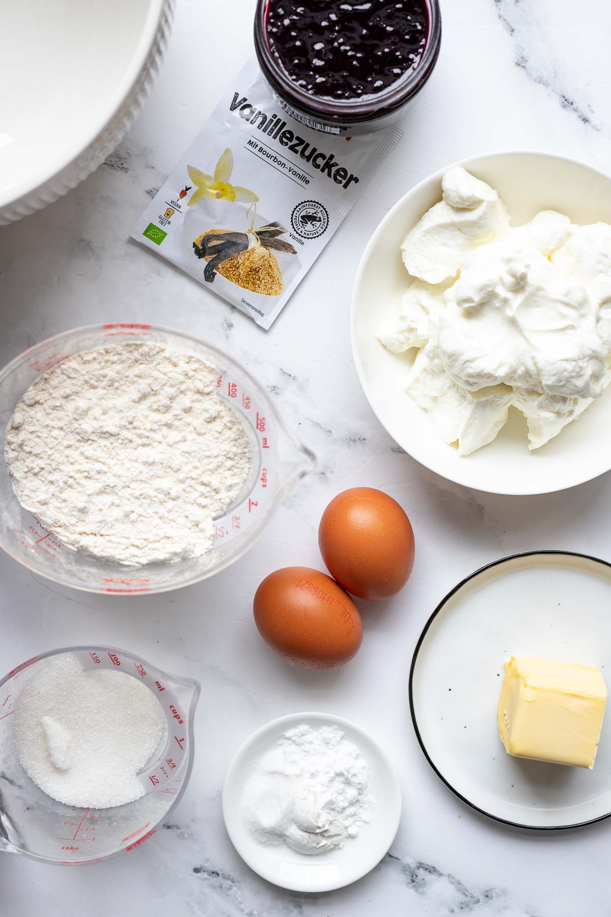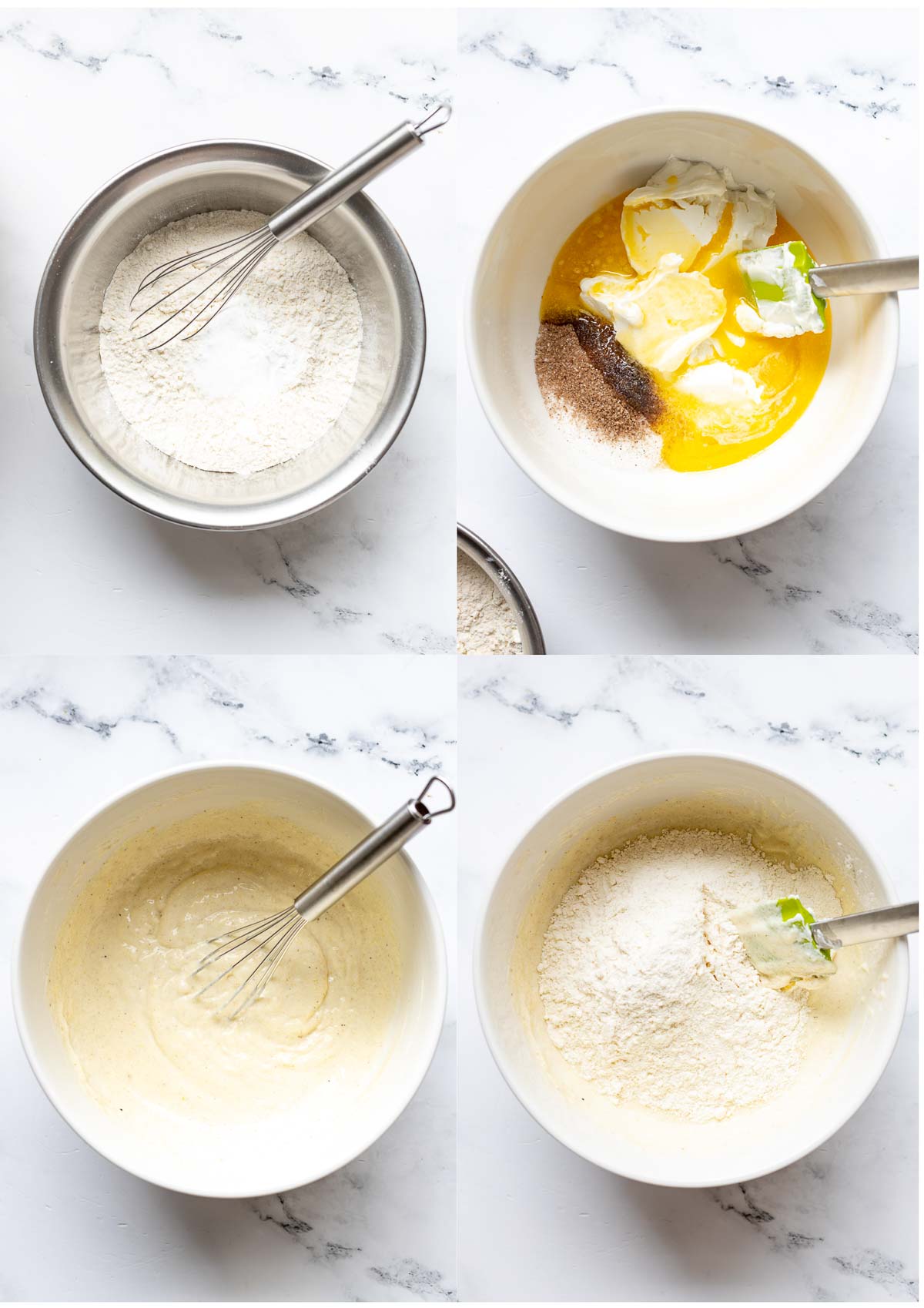 In second bowl, whisk together the eggs, yogurt, vanilla sugar, melted butter, and sugar. Then gently stir in the flour mixture until just combined. Do not over mix!