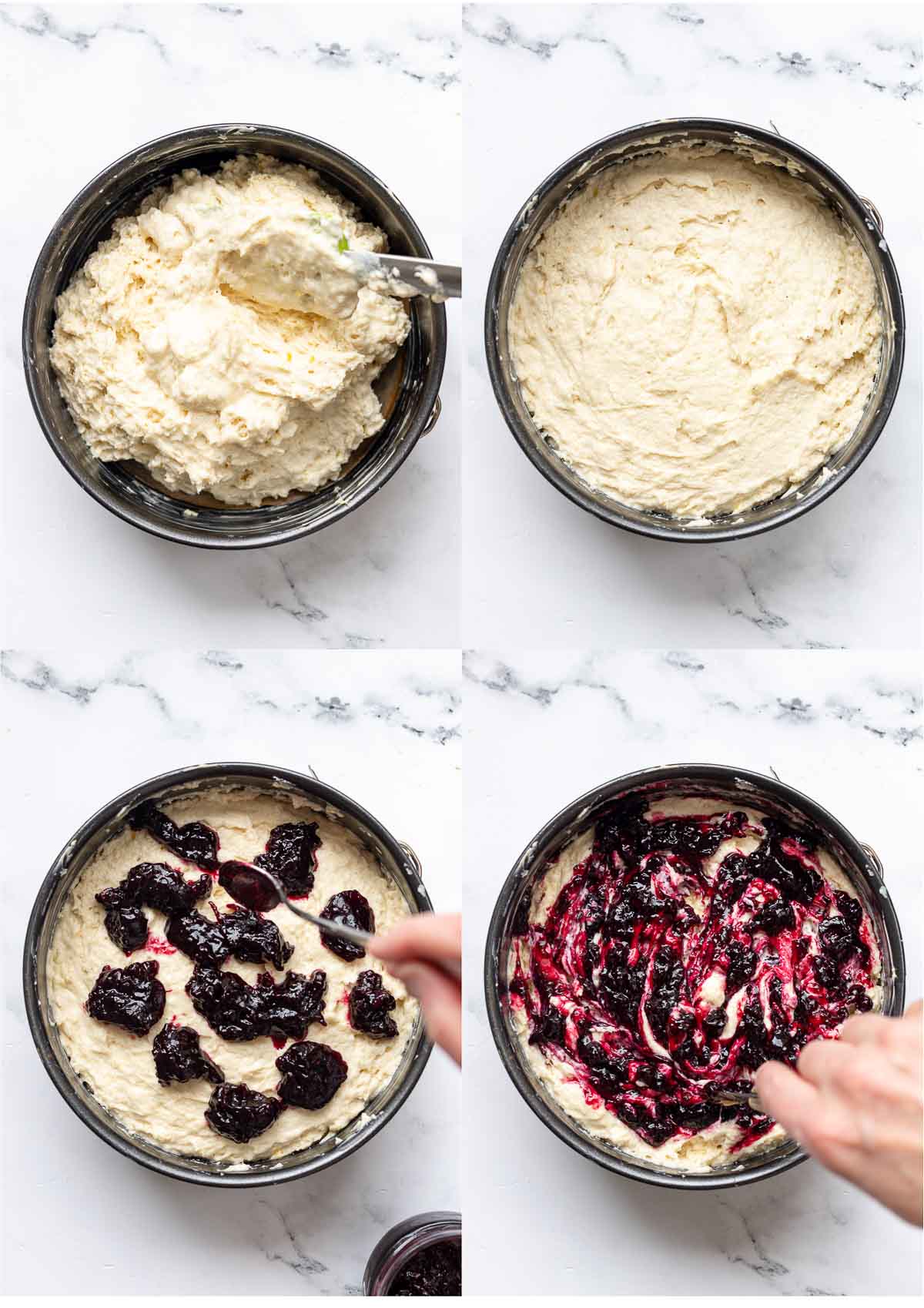 Scrape the batter into the prepared pan with the help of a rubber spatula and then smooth the surface so it is even. Dollop the jam evenly over the cake batter. Use the tip of a small paring knife to swirl the jam into the batter slightly (don’t stir it in completely, just swirl it).