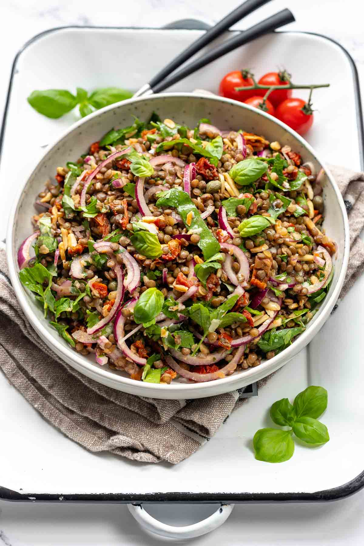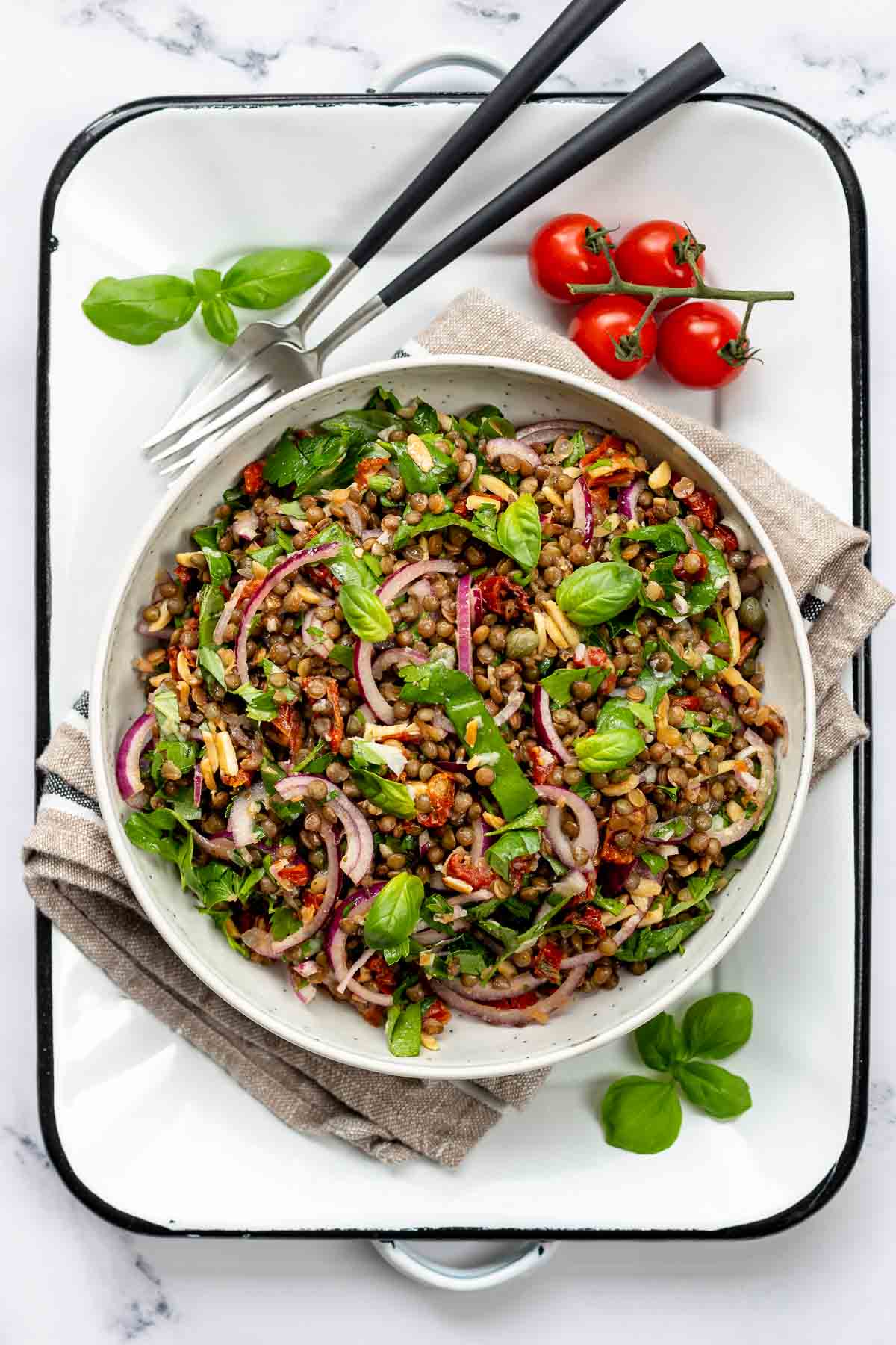 An easy to make, bright and flavorful Mediterranean Lentil Salad with sun-dried tomatoes, capers, fresh parsley, basil and pine nuts! Perfect as a side dish or served as a main meal salad.