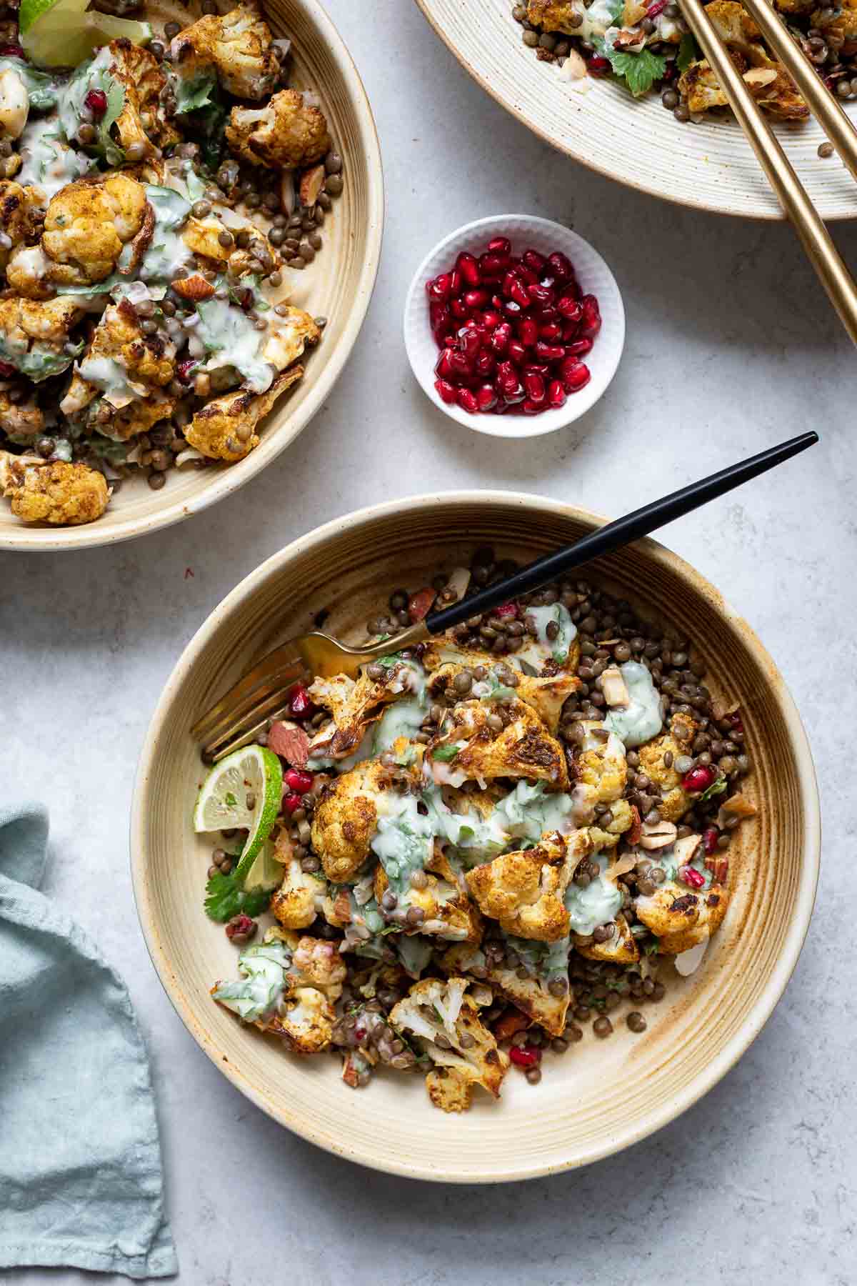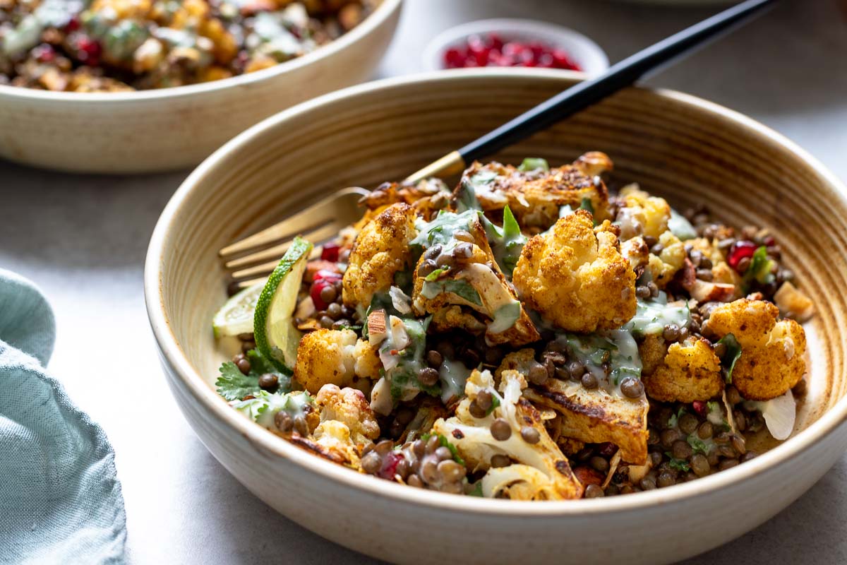 For a vegan version of this Moroccan cauliflower with lentils recipe, simply trade out the Greek yoghurt for natural coconut yoghurt and replace the lemon with lime juice. The dressing will be a little more subtle in taste and have a light coconut flavor — also delicious!