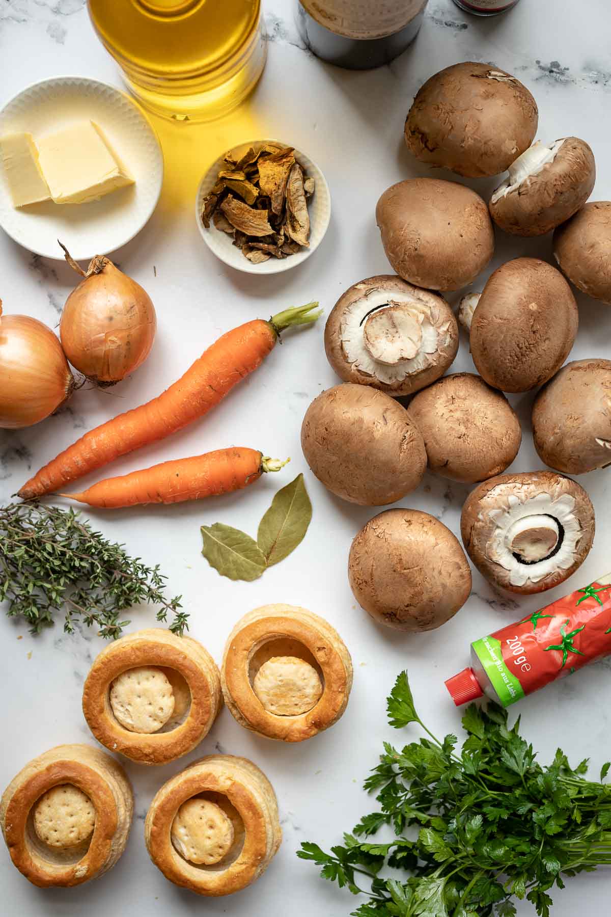 Mushroom Bourguignon makes for a healthy and comforting vegetarian meal that’s rich in delicious umami flavor. This plant-based version of the French classic Boeuf Bourguignon is made with dried and fresh mushrooms for a “meaty” texture rather than beef and cooked in a rich stew made from red wine, vegetable stock, vegetables, herbs, and seasonings. The finished mushroom bourguignon, in this case, is served over with vol-au-vent pastry cases for a delicious holiday meal, but can also be served over a bed of mashed potatoes, polenta, or pasta noodles. It’s a rich stew, wine-based stew that’s best enjoyed on a cold winter day!
