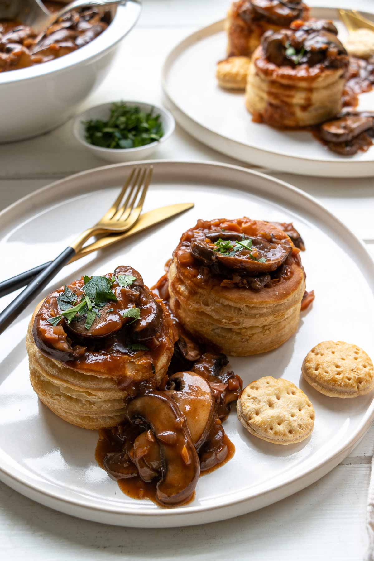 Transfer the pastry cases to a serving plate. Fill the centres with the hot mushroom bourguignon mixture, letting the excess cascade down the sides. Sprinkle with parsley and enjoy!