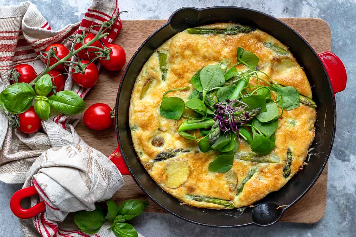 The great thing about any frittata is that you can play around with the flavour combinations. Yes, they are a great way to clean out the fridge! You can swap out the asparagus for broccolini, or trade the potatoes for sweet potato. Or try throwing in a handful of peas! You can add fresh herbs like chives or basil. Parmesan can be replaced with cheddar cheese, feta or goat’s cheese. As for serving it, try topping with young salad leaves or arugula.