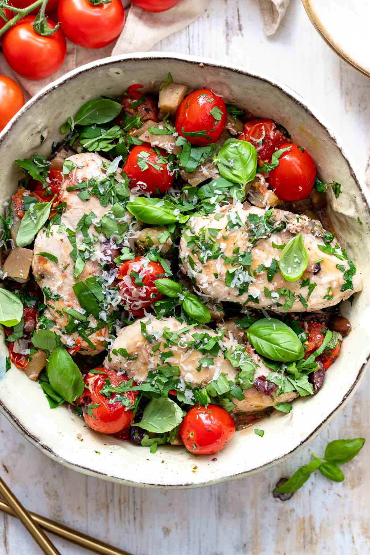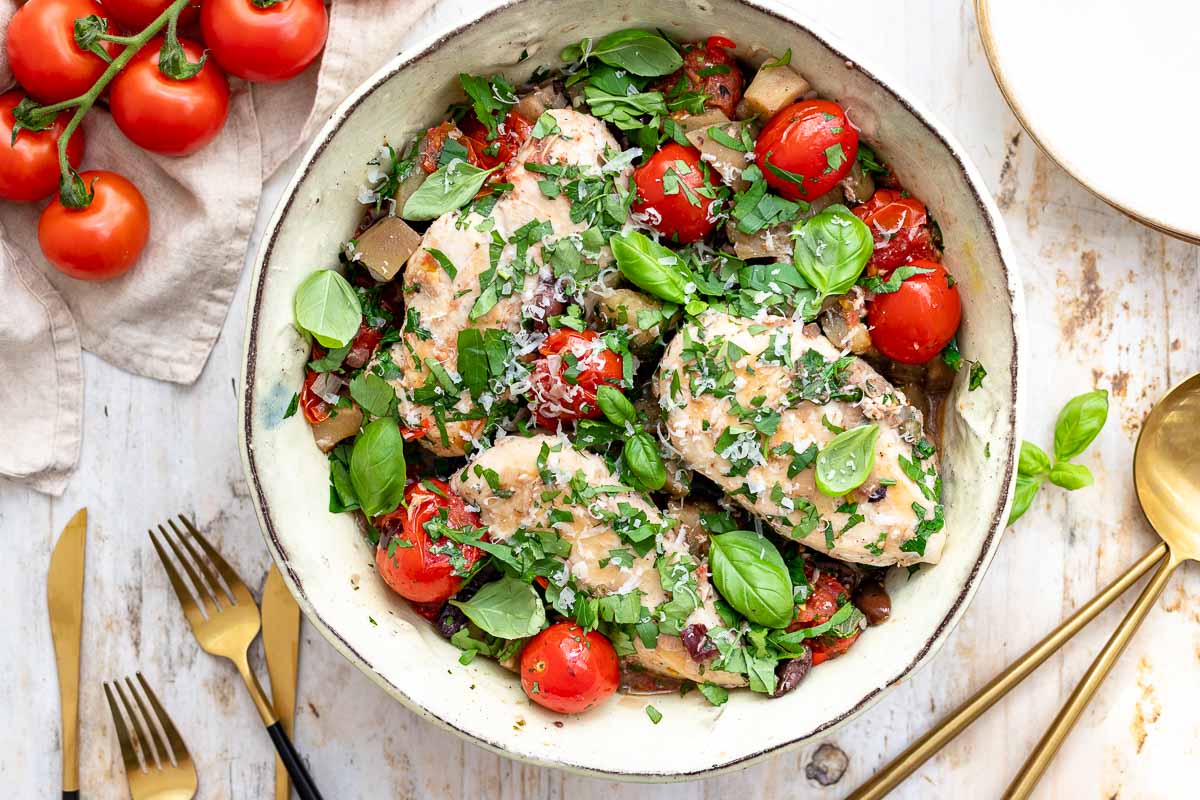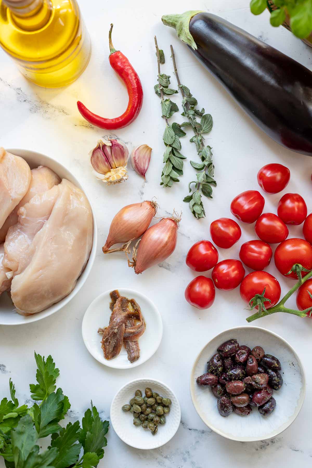Chicken Puttanesca is a delicious and easy one-skillet meal. It starts with pan fried chicken breasts, aubergine and a classic puttanesca sauce. It’s made with amazing Mediterranean flavors such as cherry tomatoes, garlic, olives, capers, anchovies, fresh oregano, and olive oil. This dish is the perfect weeknight dinner – it’s easy to throw together, perfectly filling and delicious! All the ingredients are typical of Italian cuisine and complement each other perfectly.