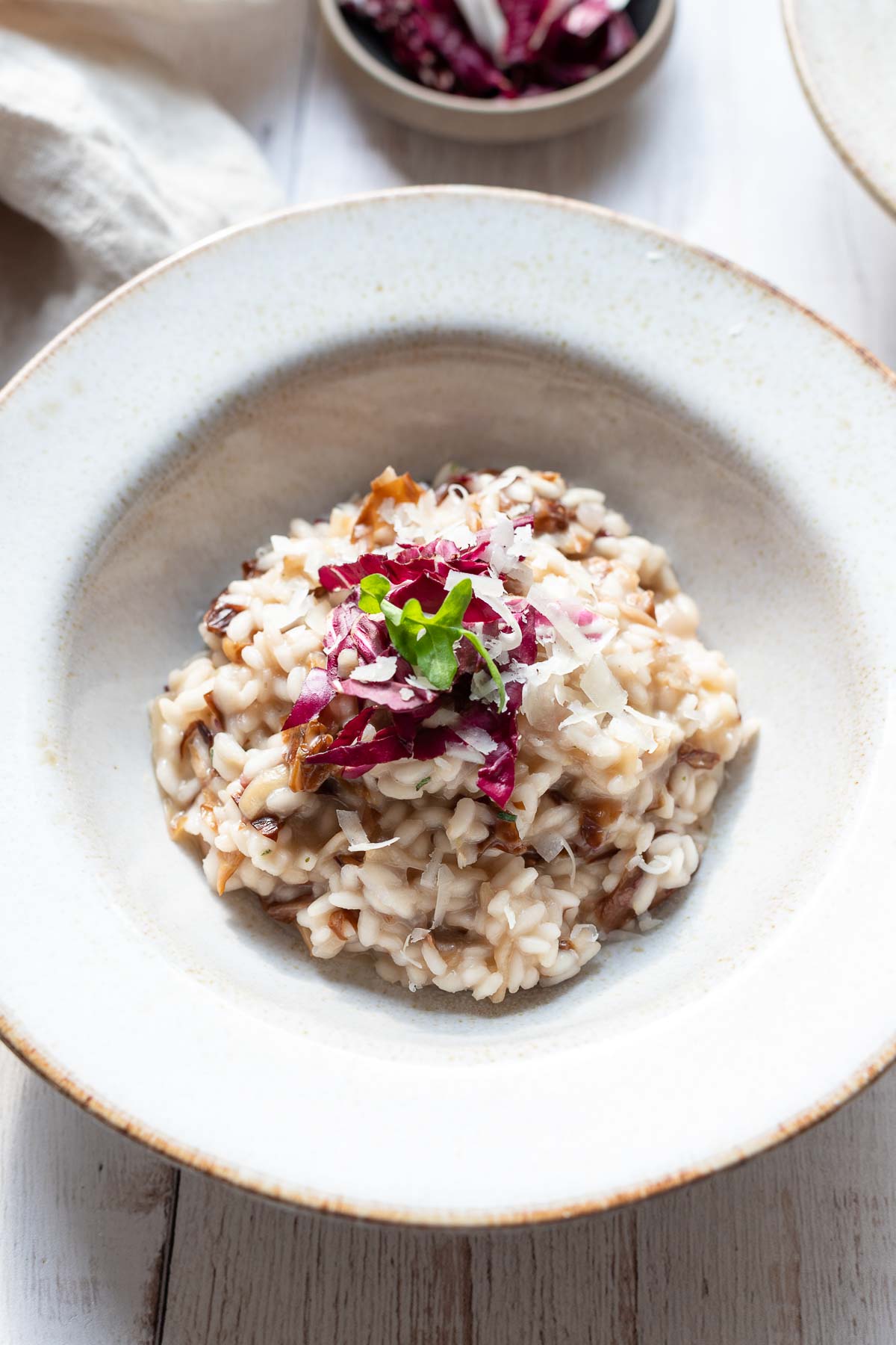 In Italy, this risotto with radicchio recipe would be considered a starter, however I like to enjoy this as a main. Feel free to enjoy it topped with with a little shredded raw radicchio or arugula, or alternatively, it can be garnished with toasted walnuts, or with a crumbling of chorizo, crispy bacon, pancetta or prosciutto. For a more filling main, serve it alongside roasted chicken and a simple green salad.