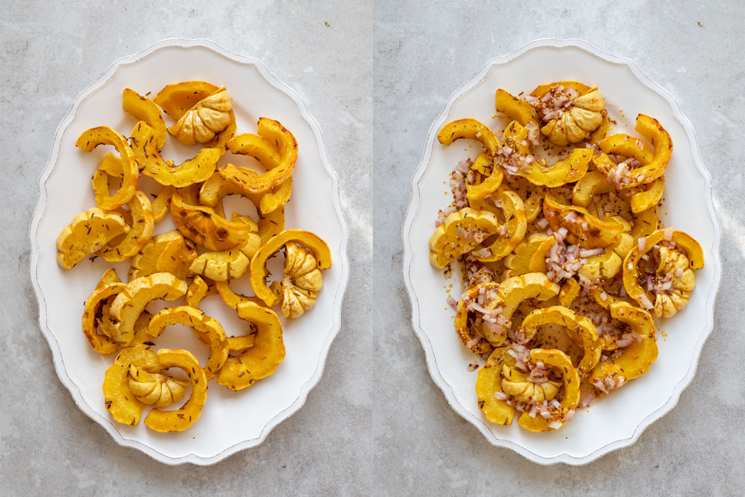 Once the squash is done, gently transfer it to a serving platter, then spoon the dressing over top.