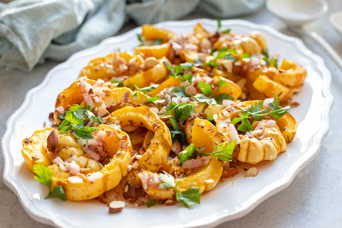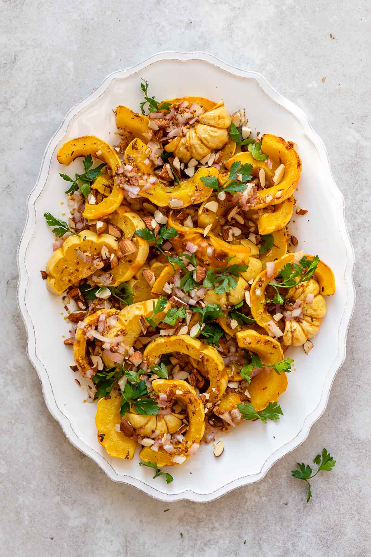 Are you familiar with delicata squash? Also called sweet dumpling squash, this winter squash, which is cousin to butternut squash, has a sweet, velvety flesh that tastes amazing when roasted and caramelised in the oven. In this recipe, delicata squash is roasted with cumin seeds and and served with a tangy apple cider vinaigrette, and topped with crunchy almonds, parsley for a pop of color and freshness, and crumbled feta (optional, but delicious!). It makes a terrific side dish, or a light lunch for for two.