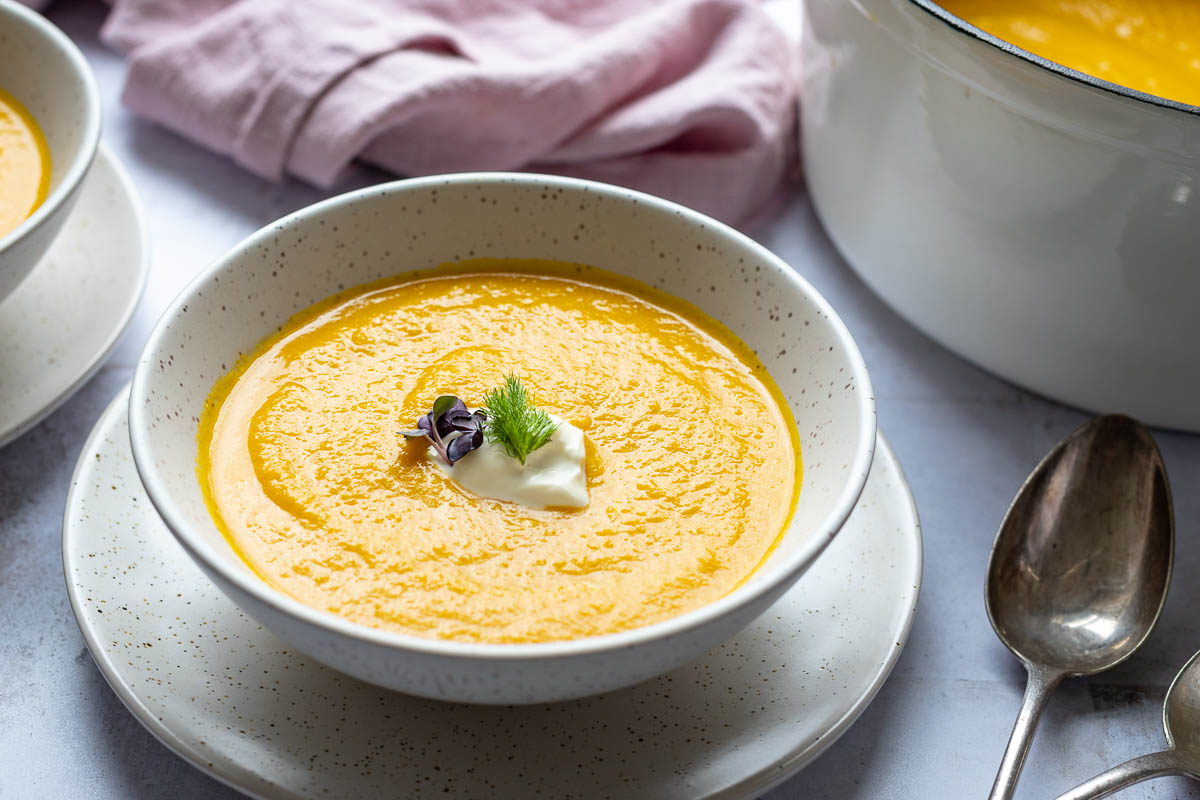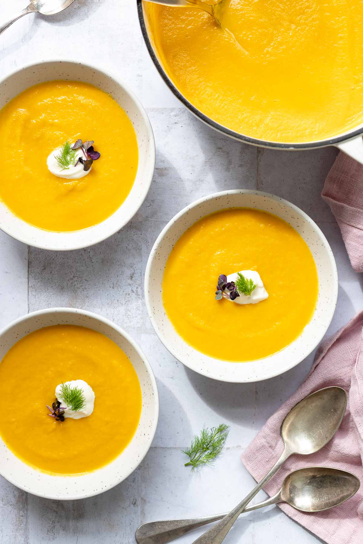 This carrot soup recipe comes together really easily on the stovetop (no pre-roasting the vegetables). You simply cook the onions down first, then add the carrots and fennel and cook for another few minutes, before adding the remaining ingredients. It simmers away until everything is tender and then it blended into a beautiful creamy soup. You could of course use an immersion blender, but I think its really at its best when it is blended using a high powered stand mixer. It’s the best at achieving a smooth, velvety texture. And if you are really wanting to impress, you could then pour it through a fine-mesh sieve to get the absolute silkiest soup possible.