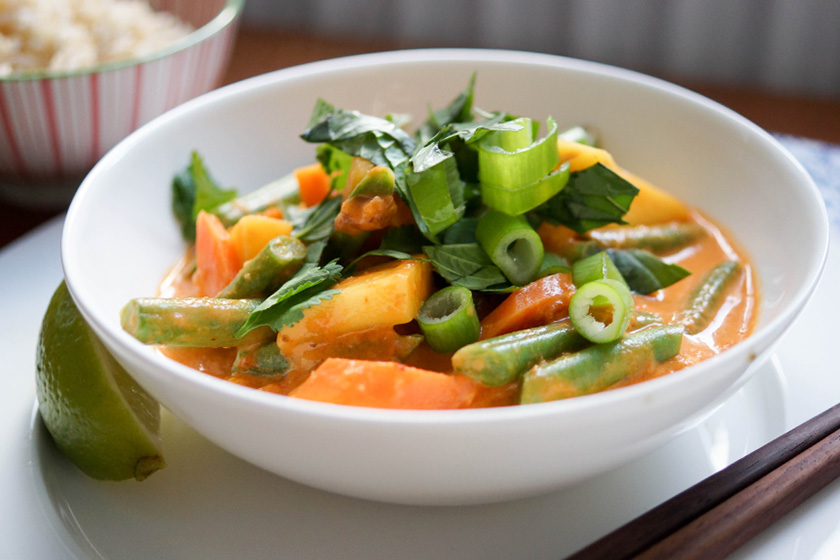 One of the things that really makes Thai food stand apart is its vibrant flavors. Bursting with spicy, sweet, and tart flavors, this red Thai curry and is loaded with fresh vegetables and herbs, keeping it fresh and light.