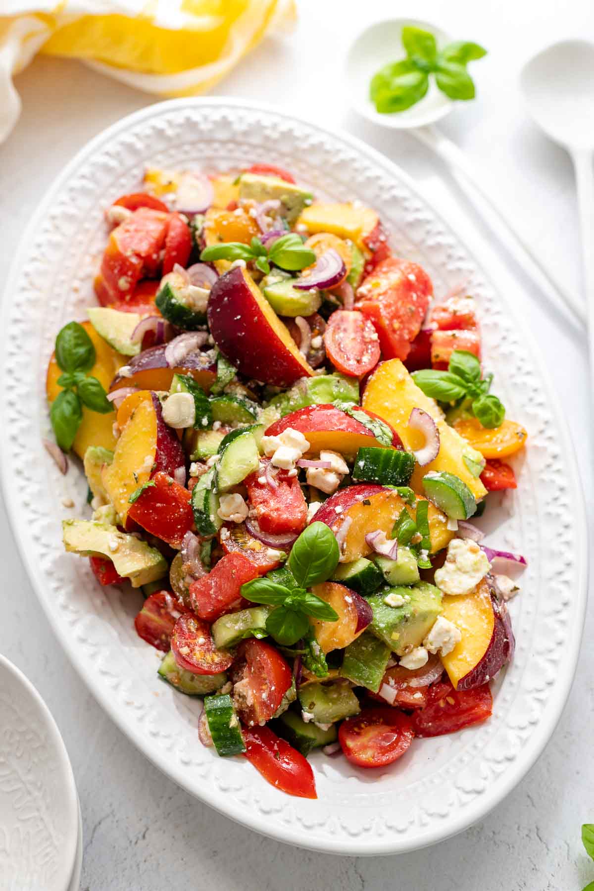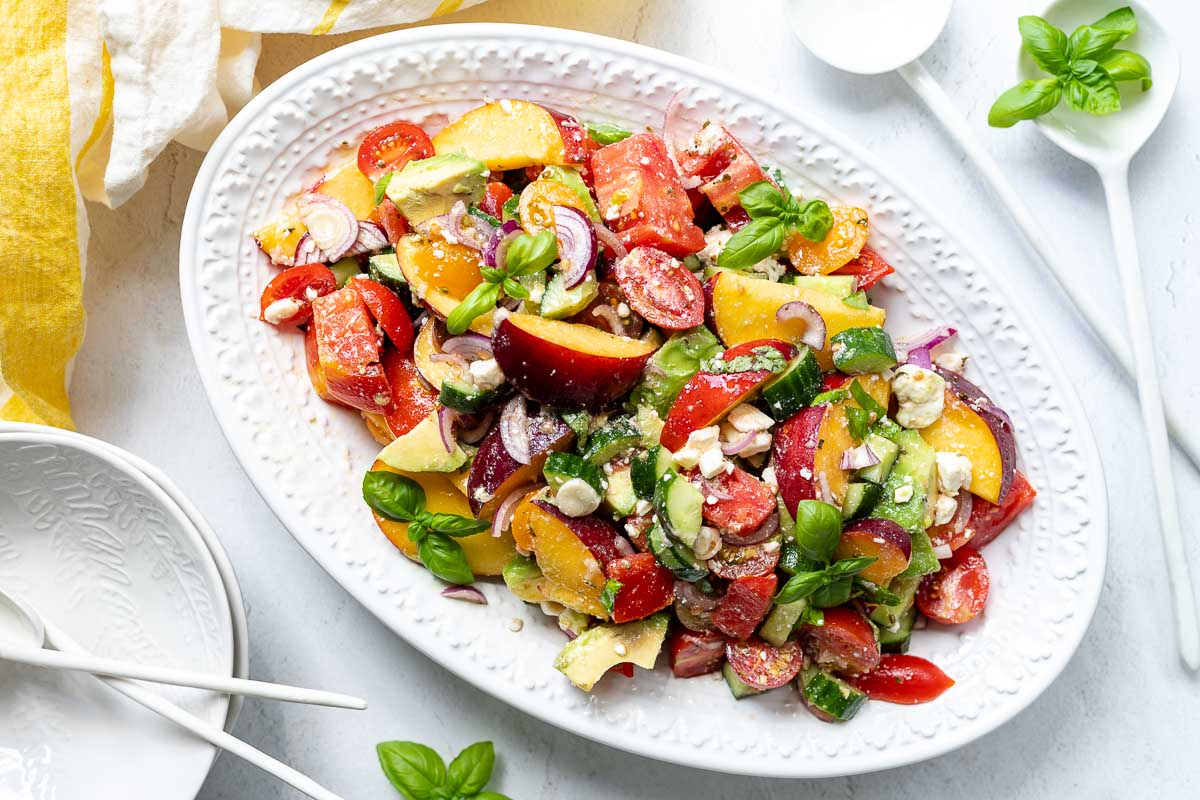 The best thing is how QUICK and EASY it is to make. And of course, you really cant’t go wrong by pairing tomatoes and stone fruit. They have a perfect balance of acidity and sweetness that is taken to the next level with tangy, slightly salty tasting feta. If you are looking for a simple, no-cook salad that’s perfect for barbecuing, then this summer salad is here to please!
