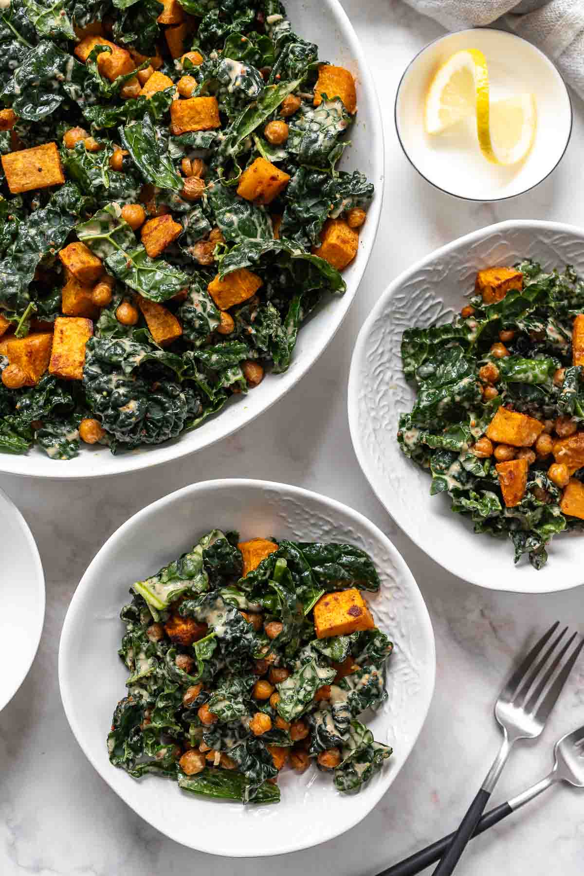 - Chickpea and Sweet Potato Salad – The inspiration for this Kale Caesar Salad recipe! Similar in spirit but made without the kale or dressing. Simple, nourishing, and every bit as delicious.