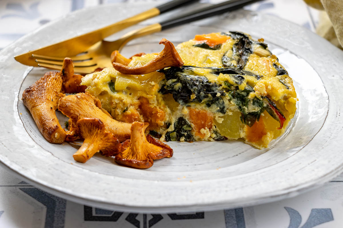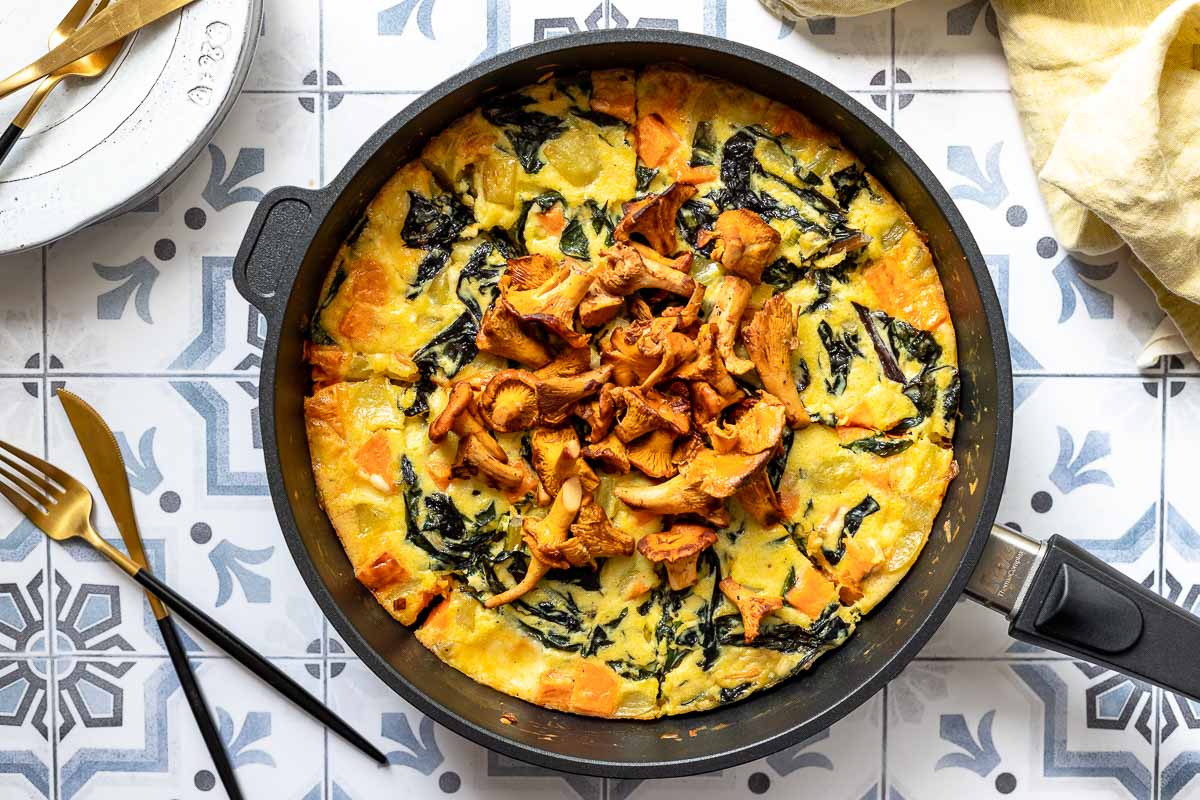 In a second skillet heat 1 tablespoon oil over medium-high to high heat. Add the chanterelles. And cook, stirring often, for about 5-7 minutes, or until golden brown. Season with salt and pepper. Top the frittata with the chanterelles, when serving.
