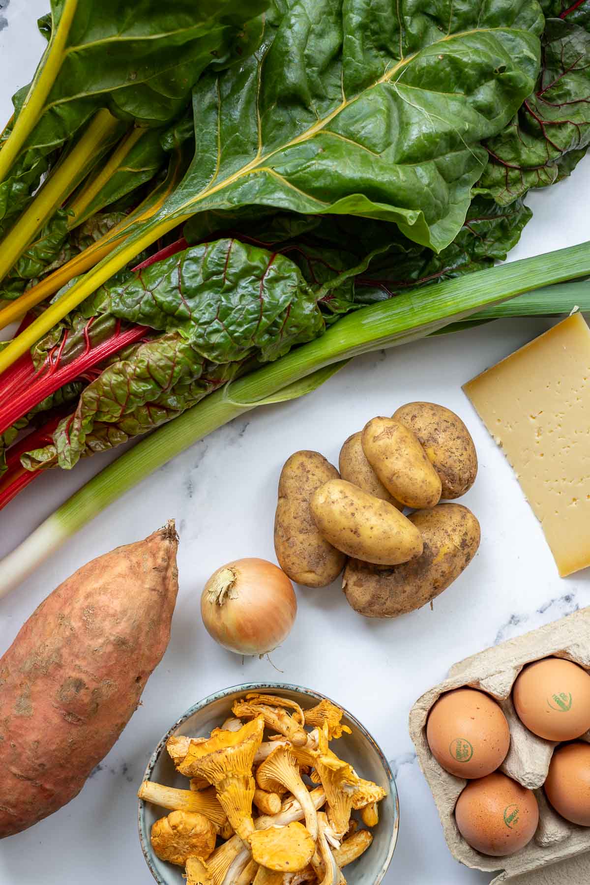 Baked vegetable frittata is the easiest way to make a frittata. The cooking starts on the stovetop and finishes in the oven. This vegetarian frittata is filled with roasted sweet potato and potato, plus sautéed leeks and Swiss chard.