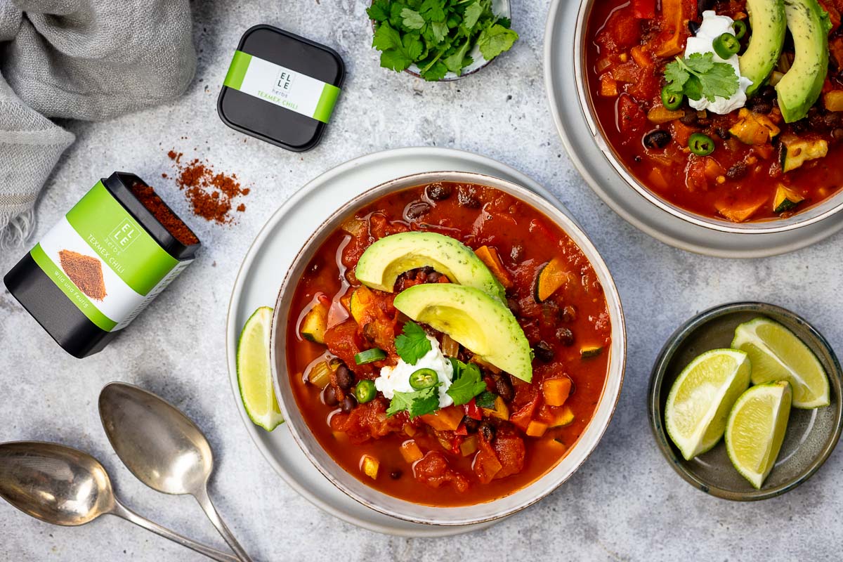 And here is my secret ingredient to transforming a simple vegetarian one-pot dish into something rich with TexMex chili flavors. The chili seasoning is a mix of spices like smoked paprika, rosemary, cumin, oregano, along with chili powder, smoked peppercorns and cacao (the secret to a good chili!). And I’ll share another little secret, or rather a tip, it’s also is fantastic on oven roasted potatoes or homemade fries.