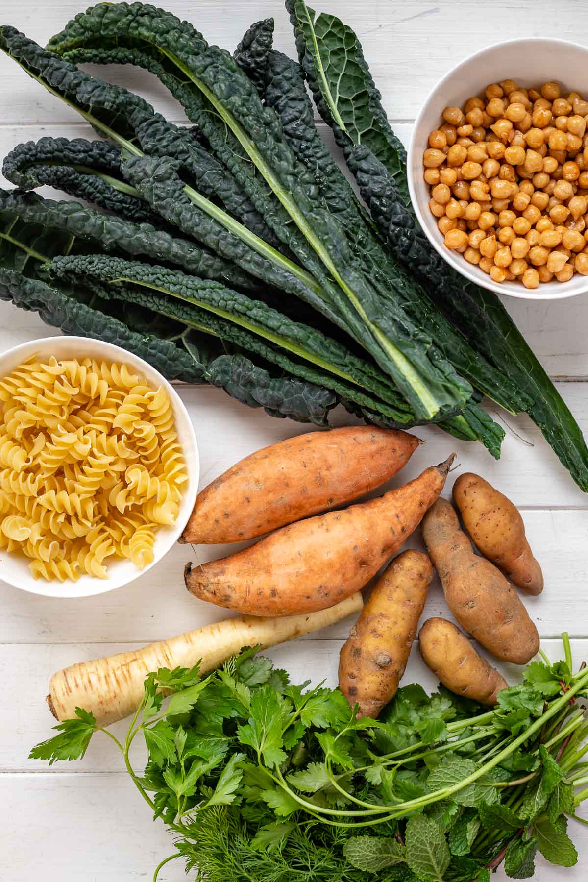 - 1 bunch of Tuscan kale, stemmed and coarsely chopped (or curly kale)