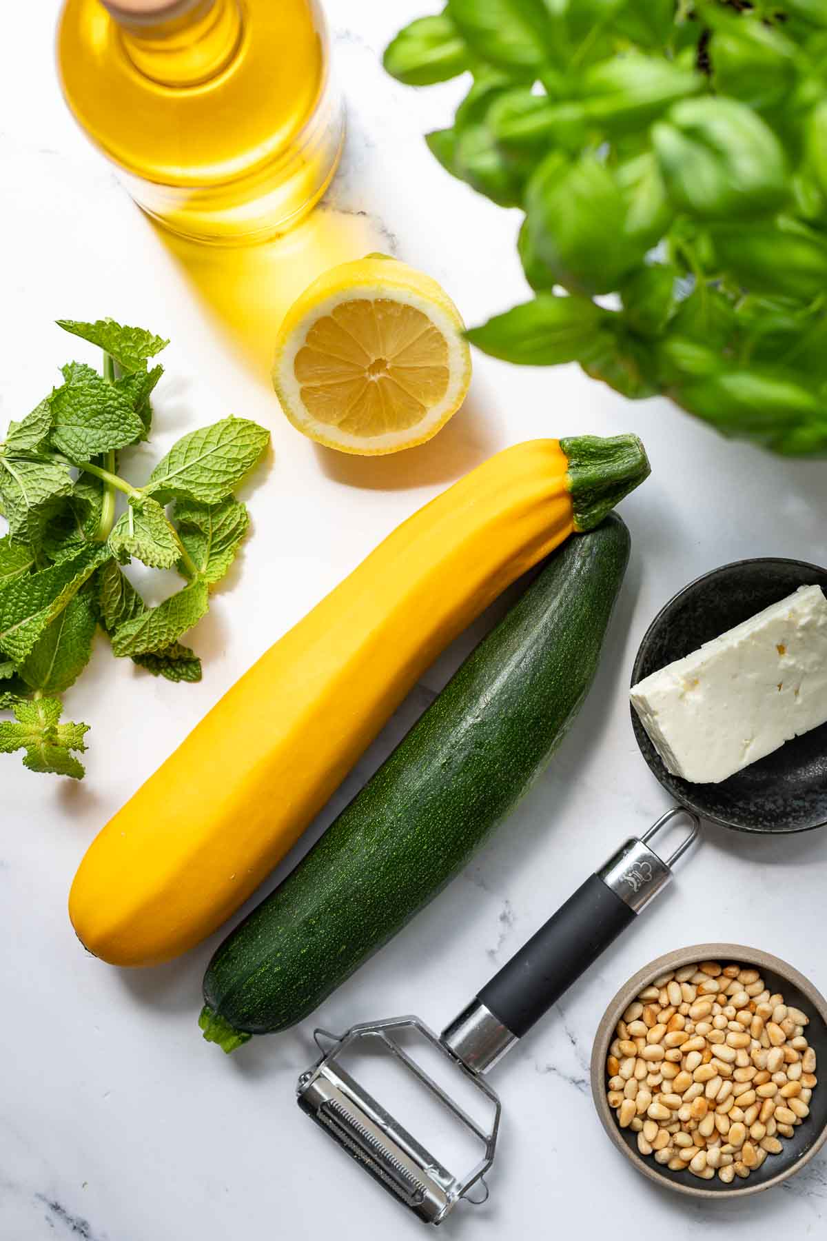 Zucchini: It’s important to use the freshest zucchini you can get your hands on — either from your garden or the farmers market. Fresh zucchini will be very firm. You can use green or yellow zucchini (called summer squash) or a combination of the two to give the salad a little more colour.