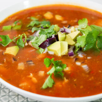 Die Suppe in Suppenschalen geben und mit roten Zwiebeln, Avocado und Koriander garnieren. Sofort servieren.