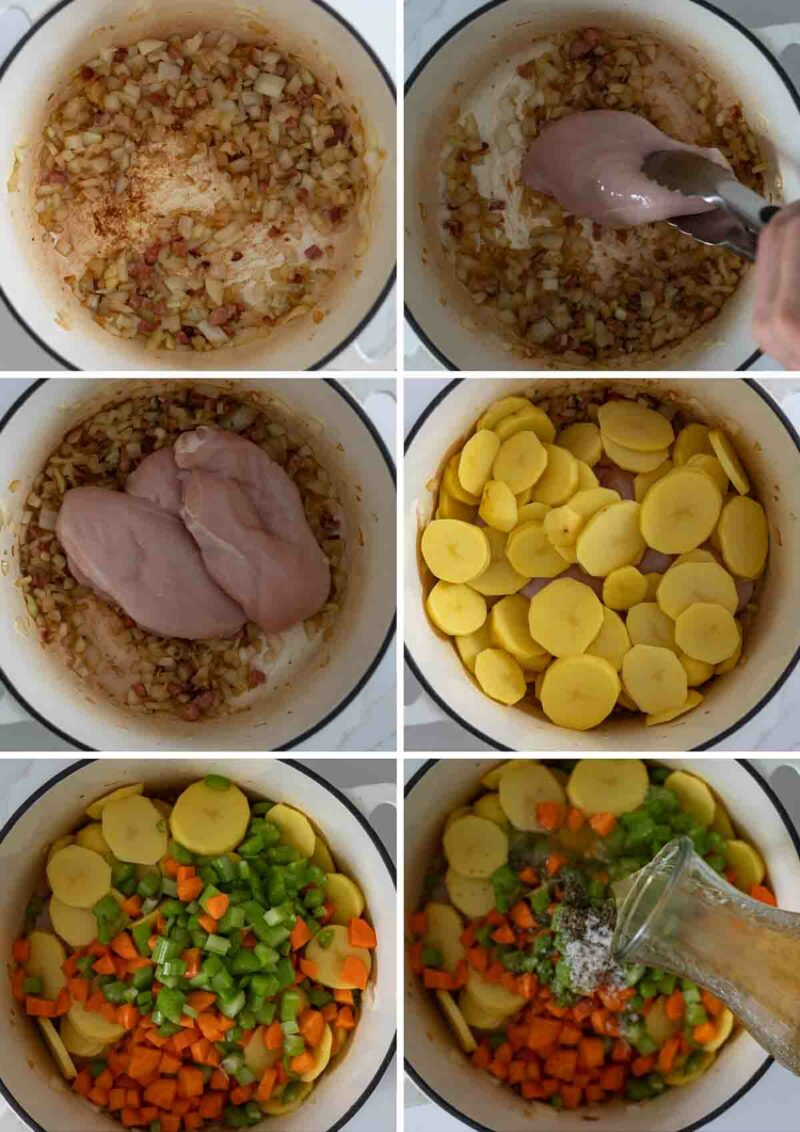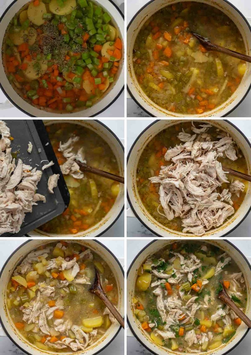 Hähnchenbrusthälften auf die Zwiebeln legen und Kartoffeln, Karotte, Sellerie, Hühnerbrühe, Thymian, Salz und schwarzen Pfeffer dazu geben. Die Suppe auf mittlerer Stufe köcheln lassen, bis die Kartoffeln sehr weich sind und die Brühe dickflüssig machen (ca. 40 Minuten).