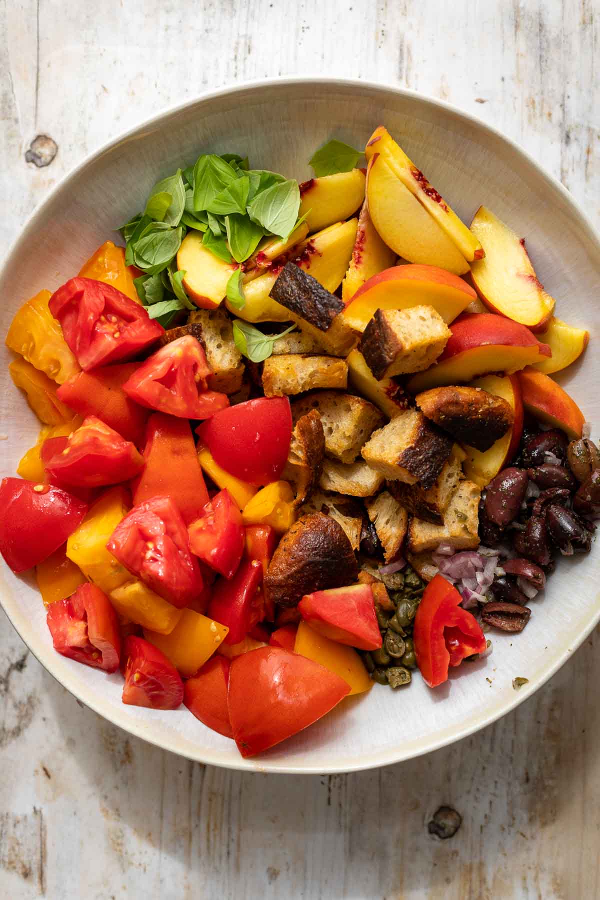 In einer großen Servierschüssel die Zutaten (Olivenöl, Essig, Salz und Pfeffer) vermischen. Weitere Zutaten (Schalotten, Oliven, Kapern, Tomaten, Pfirsich, geröstete Brotwürfel) dazu geben und gut vermischen. Basilikumblätter dazu geben und nochmal vermischen.