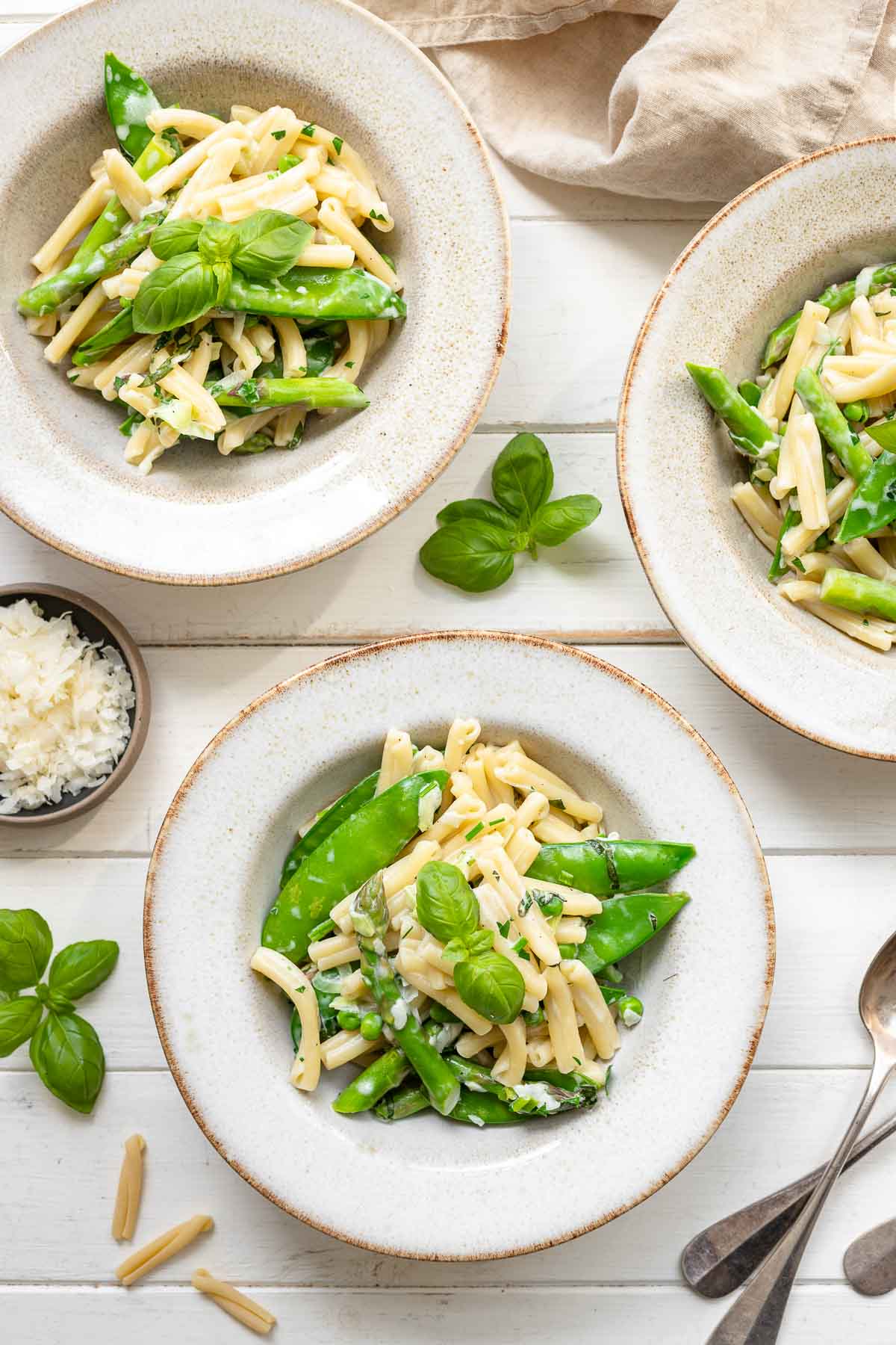 Primavera bedeutet Frühling. Und da viele Frühlingszutaten für dieses Rezept benötigt werden ist Frühlings-Pasta auch die richtige Bezeichnung für dieses leckere Essen. Ihr könnt das Rezept aber auch verändern und Euer Lieblingsgemüse verwenden. In meiner Version habe ich eine Mischung aus grünem Frühlingsgemüse gewählt. Ihr könnt gerne mehr Farbe mit roter Paprika, Karottenstreifen oder Mini Roma Tomaten dazu geben. Oder Ihr macht einfach Primavera Spaghetti daraus, indem Ihr statt kurzer Pasta Spaghetti verwendet.